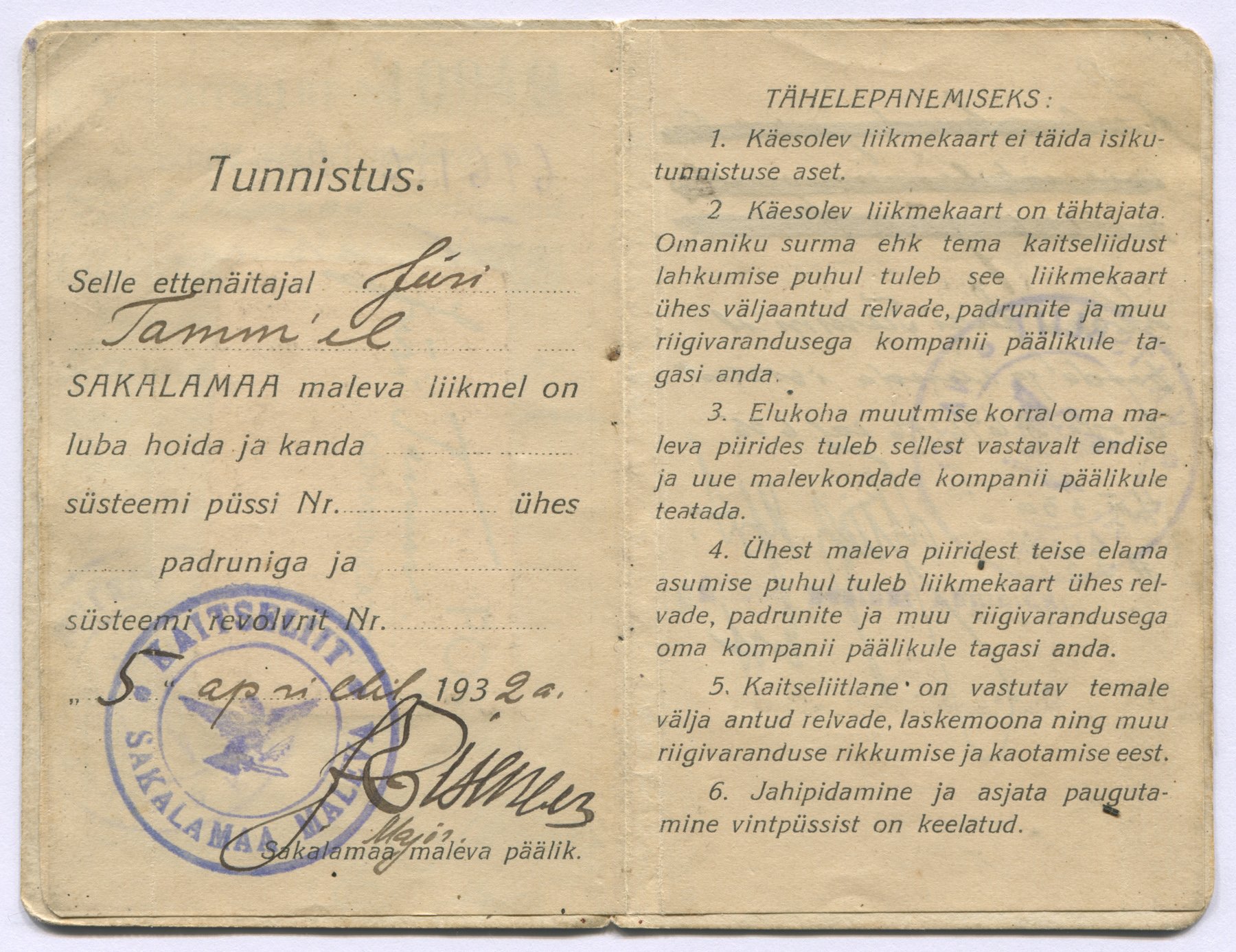 Kaitseliitu astusin 1932. aasta 5. aprillil. Tuli astuda ratsaüksuse koosseisu, raskusi oli väljaõppimata hobusega ja kaugemal õppusel käimisega. Kord tuli Viljandi minna ja teisiti ei saanud sinna kui hobune sai Võhmas vagunisse pandud ja Viljandi. Samaviisi ka tagasitulek õppuselt. Nii sai aasta või paar oldud kohapeal, väljas käidud tarviduse järele.