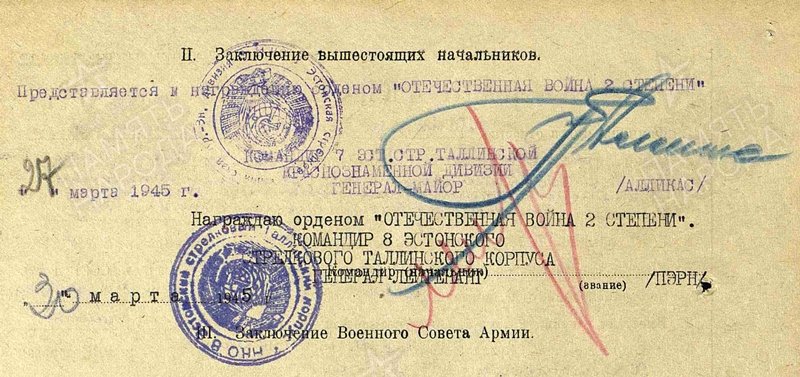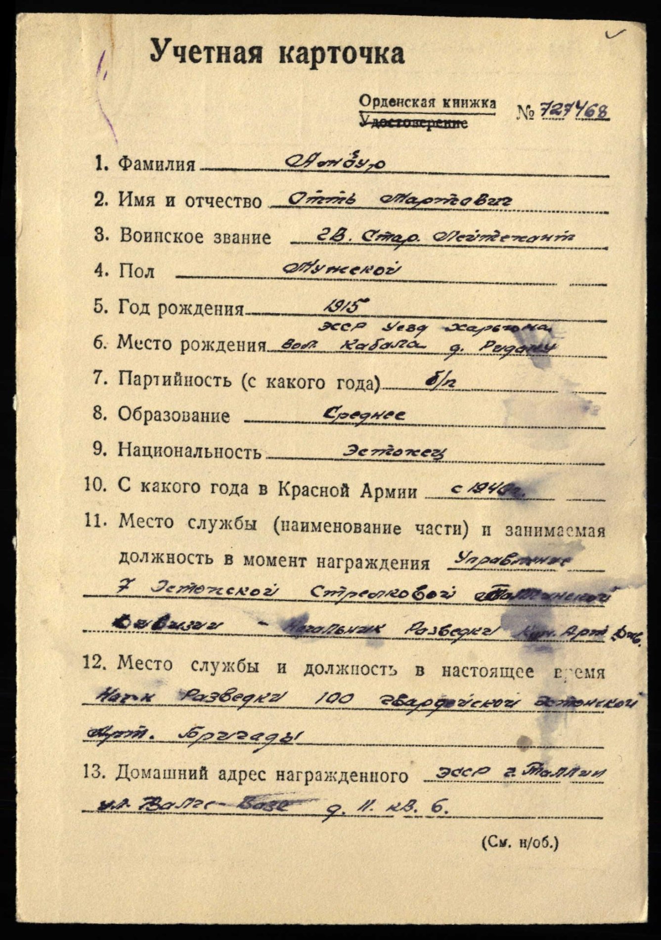 7. laskurdiviisi staabiülema abi- diviisi suurtükiväeülema staabi luureülem leitnant Ott Ambur, Punatähe ordeni nr. 843642 ja Isamaasõja II klassi ordeni nr. 428777 kavaler.