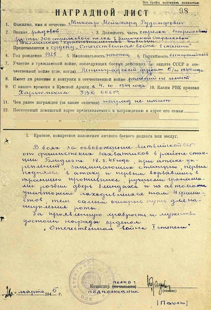 Kanda oma autasu ta aga ei saanudki, sest 14.04.1945 sai Miksar pähe raskelt haavata, suri nädal hiljem hospidalis, ning maeti 22.04.1945 Auce vennaskalmistule. Arvan, et orden anti koos ajutise tunnistusega üle kodustele.