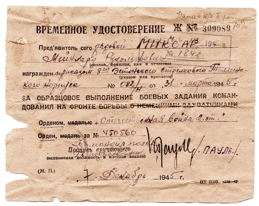 Eesti laskurkorpuse 249. laskurdiviisi 917. laskurpolgu jefreitor Karl Milistver'i Kuulsuse orden (718589) ja Vapruse medal (3356347).