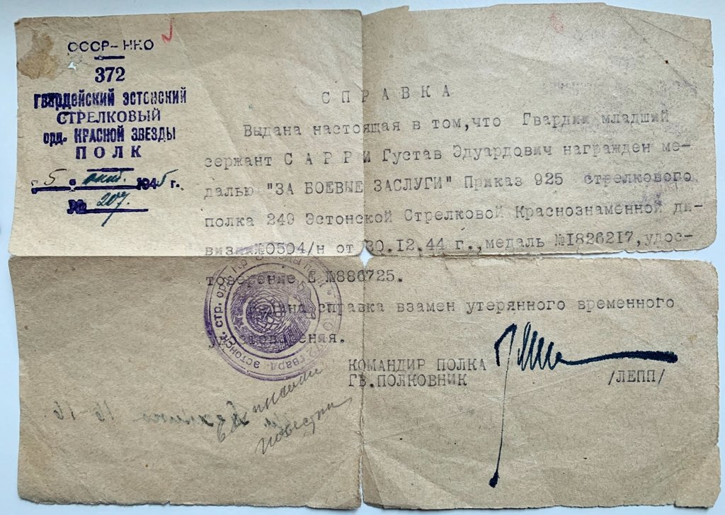 249. laskurdiviisi 925. laskurpolgu laskur nooremleitnant Sarri. Lahinguteenete medali 1826217 kavaler. Sai medali 1944. aasta sügisel selle eest, et komandeerituna trofeeüksusesse korjas eesliinil vaenlase tugeva tule all langenud sõduritelt ja ohvitseridelt relvad ära, mille tõttu polgus ei tekkinud puudust põhilistest relvaliikidest.