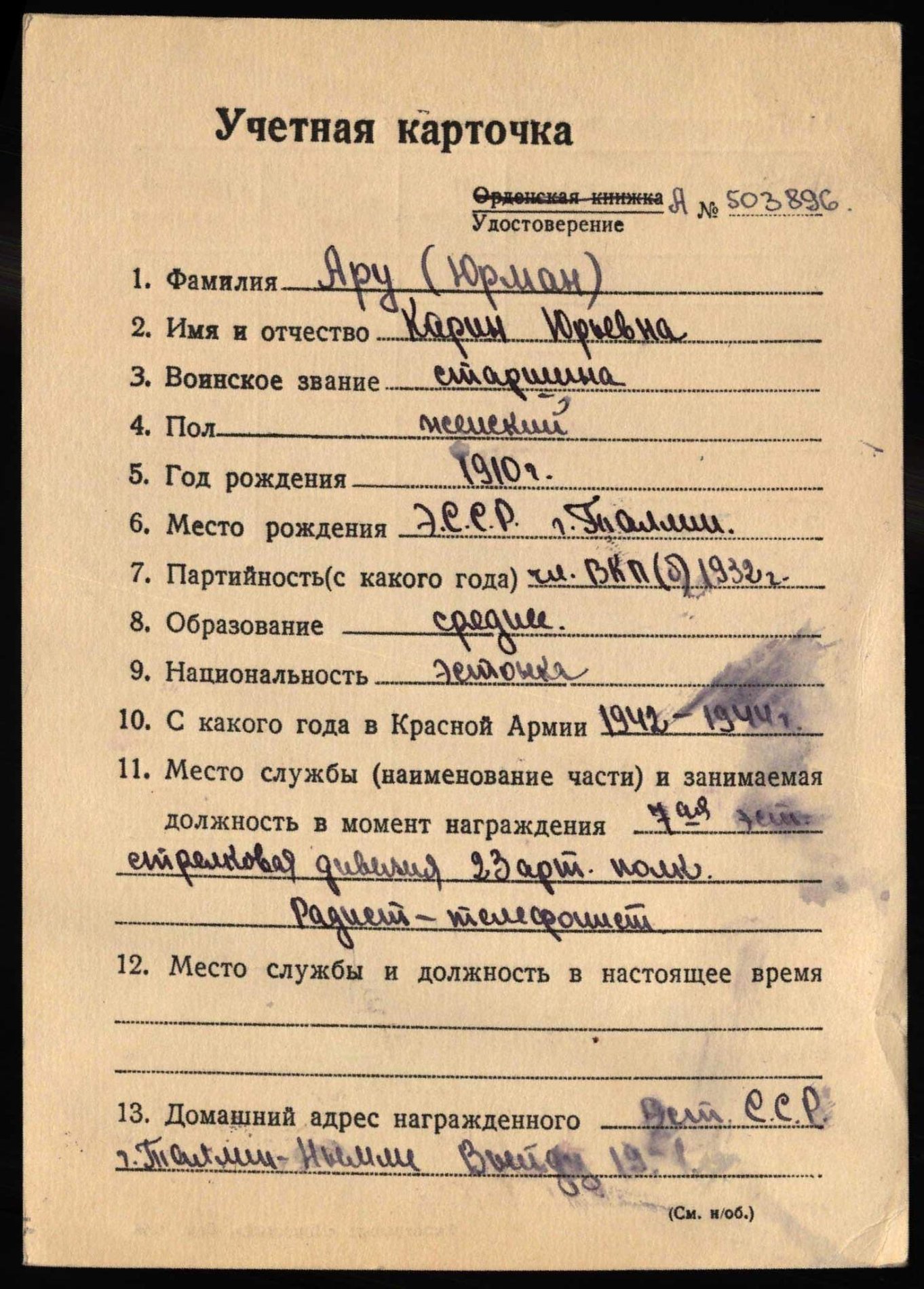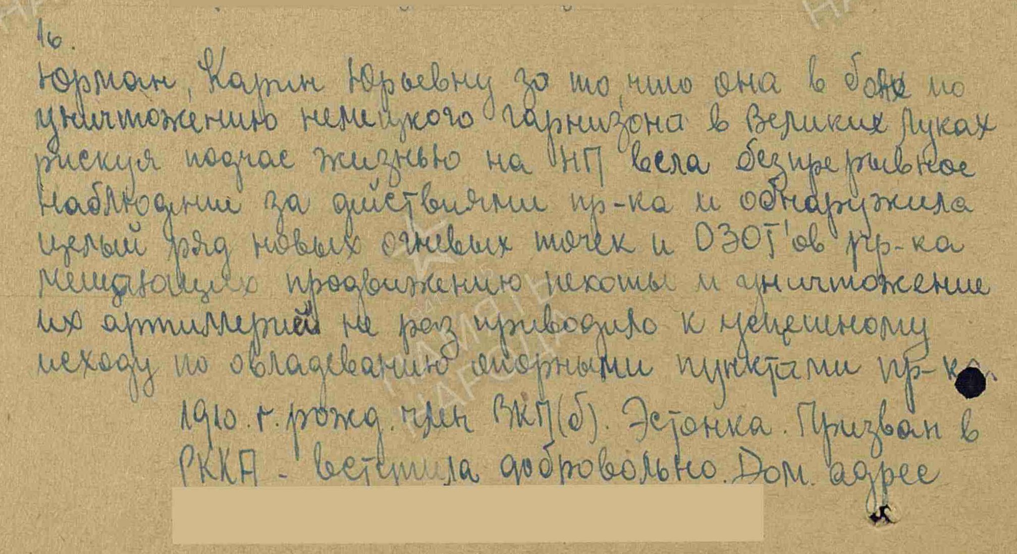 Medal annetati Velikije Luki lahingute eest, 1943. aasta 18. jaanuaril, 7. Eesti laskurdiviisi 23. suurtükipolgu radist-telefonist Karin Jurman'ile (Aru).