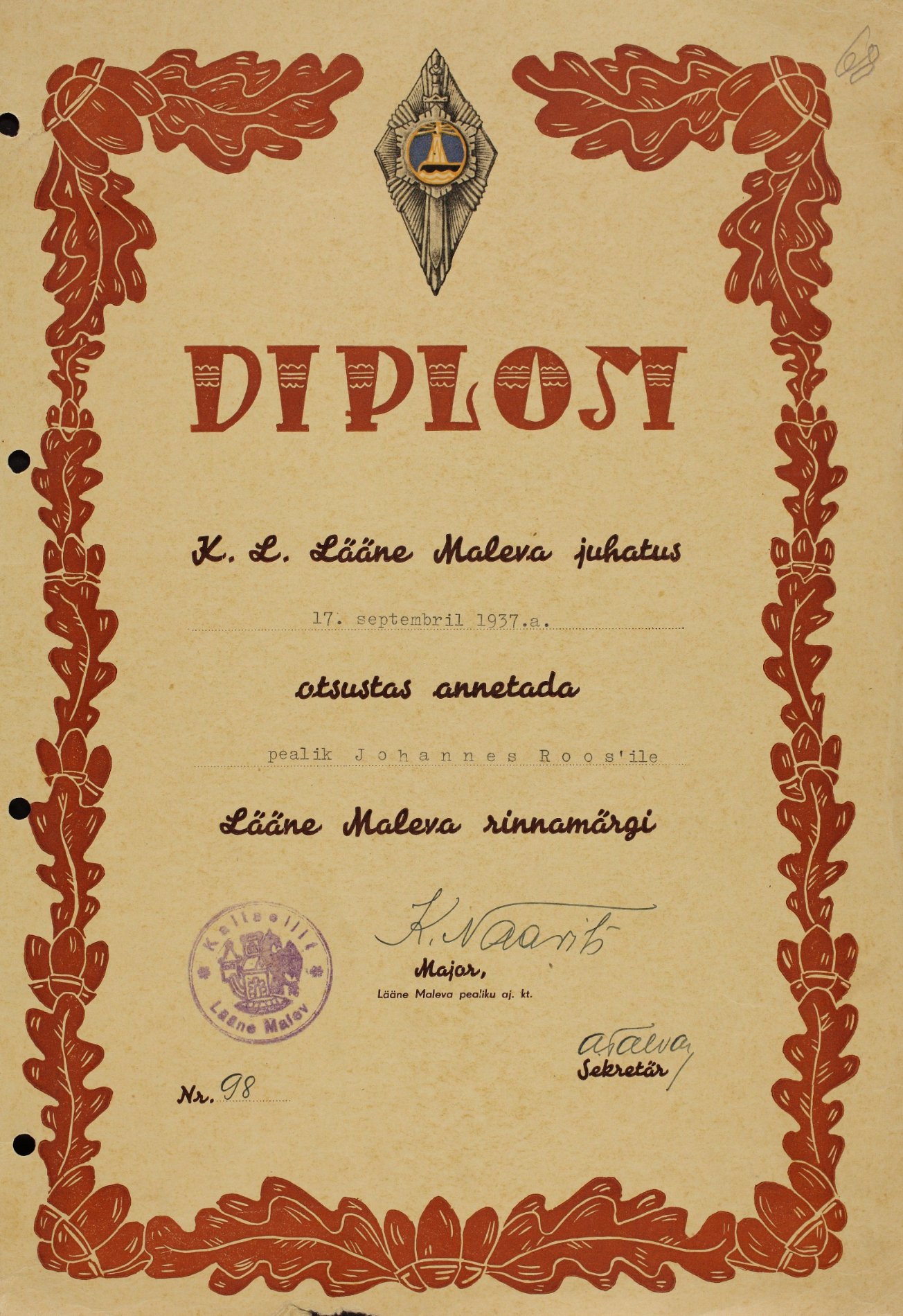 Kaitseliidu Lääne Maleva juhatuse otsusega 17.09.37 annetati maleva 20. aastapäevaks rinnamärgid järgmistele Hiiumaa malevkonna Pühalepa üksikrühma liikmele: Konstantin Ingre (Ingland), Gustav Vaarik ja Johannes Roos. Joh. Roosi diplomi originaal asub Riikliku Julgeoleku Sõjatribunali toimikus kui kuriteo asitõend. ERAF 129SM1 3785