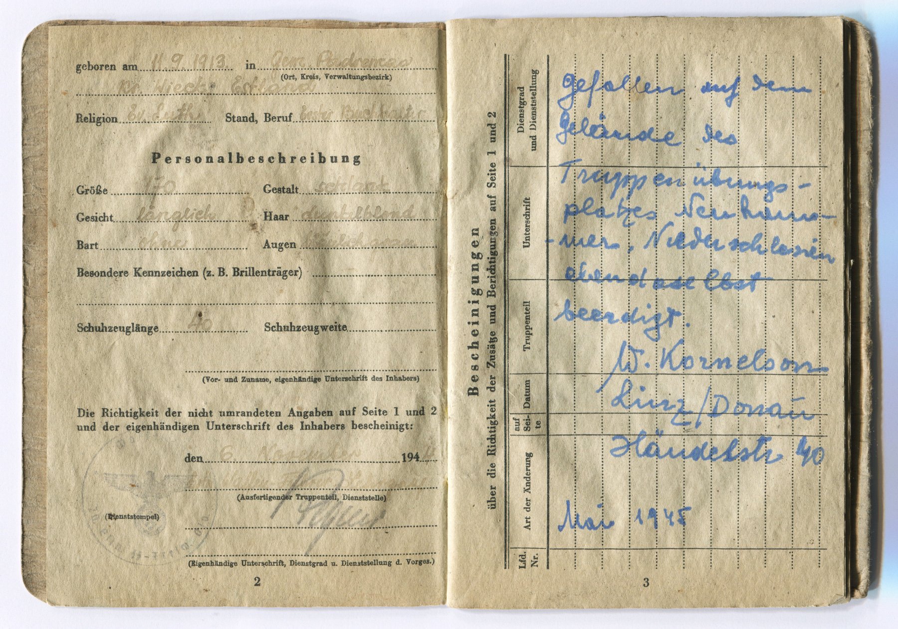 1943. aasta aprillis Eesti Leegionisse astunud Grenadier Eduard Paju Soldbuch.