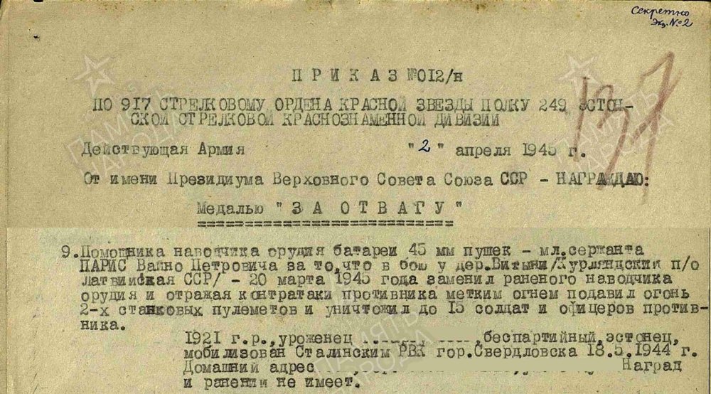 249. laskurdiviisi 917. laskurpolgu 45mm kahurite patarei sihturi abi jefreitor Väino Paris. Vapruse medali 2352679 kavaler. Autasu saadud Kuramaa lahingutes, kui Vitõni küla juures 20.03.1945.a toimunud lahingus vahetas välja haavata saanud sihturi ja vaatamata vaenlase vastupealetungile hävitas täpse tulega kaks vaenlase kuulipildujat ning kuni 15 sõdurit.