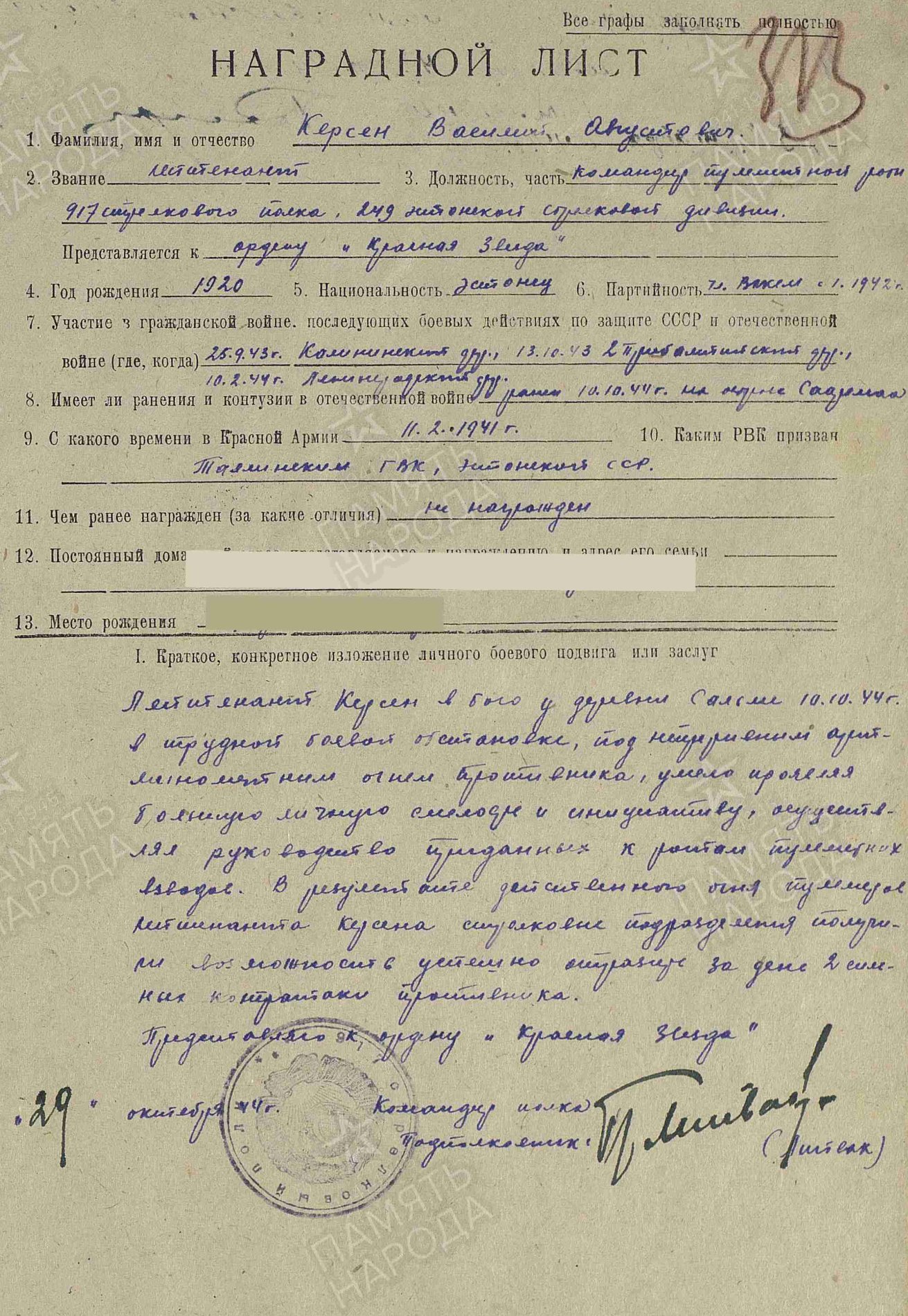 ELK 249. laskurdiviisi 917. laskurpolgu kuulilpildujaroodu komandöri, leitnant Vassili Augusti p. Kersen'i autasud.