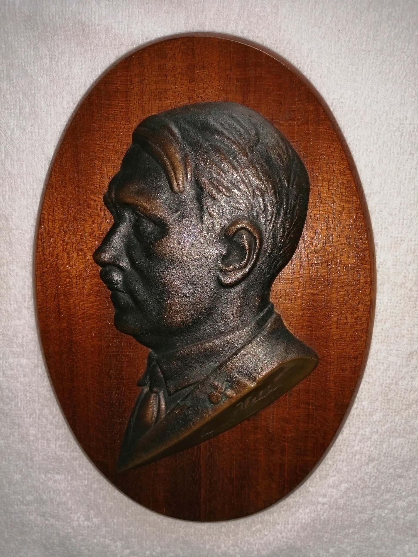 Müüa Adolf Hitlerit kujutav seinaplaat (tamm+pronks,14X20 cm.),nii-öelda Kolmanda Riigi kitš.Hind 180 €.
