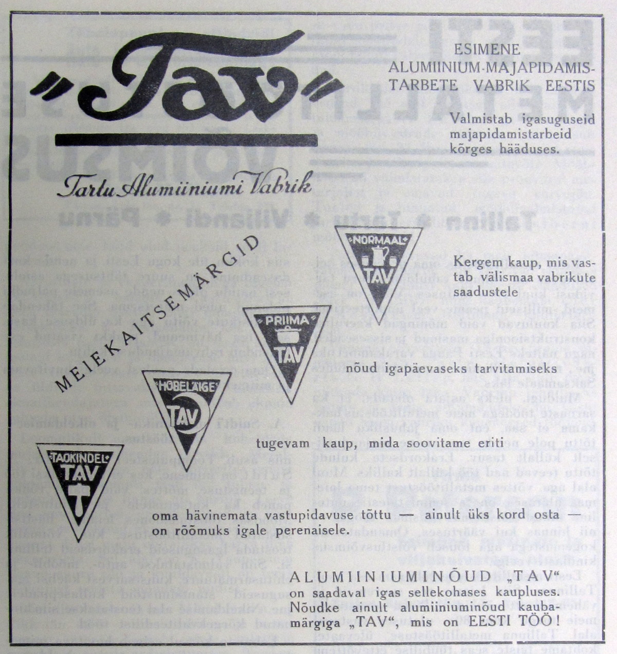 Reklaam metallitööstuse käsiraamatust Eesti Metalist (1934).
