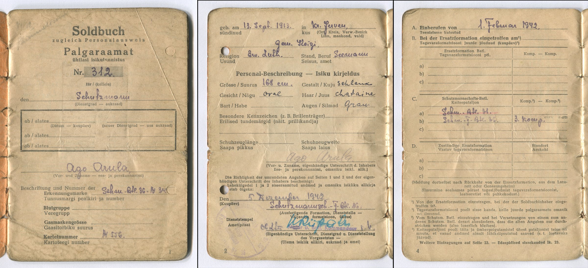 Eespool näidatud EK2 tunnistuse omaniku, reavõitleja Ago Arula palgaraamatust mõned pildid. Huvitav on, et dokument on välja kirjutatud keset kõige kibedamaid lahinguid - 1942. aasta 5. detsembril. Andmed on oma allkirjaga kinnitanud pataljoniülem Harald Riipalu, tema allkirja alla löödud templil on veel endise pataljoniülema Julius Renteri aukraad Major, mis on läbi kriipsutatud ja selle ette pliiatsiga tehtud Ob.Ltn. (Oberleutnant). Templi lõppu on kirjutatud i.V. mis on lühend saksa keelsest sõnapaarist in Vertretung ja tähendab asemel (pataljoniülema asemel).