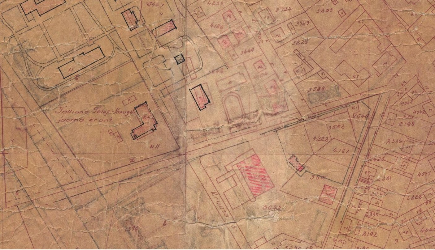 Punakaspruuni värvi joontega on kaardil olukord seisuga 1944/45. Kaugejaama krundil on olnud üks suurem hoone, mis on musta joonega üle joonistatud (taastamine või uusehitus, nt ka Estonia on samal moel üle joonistatud).