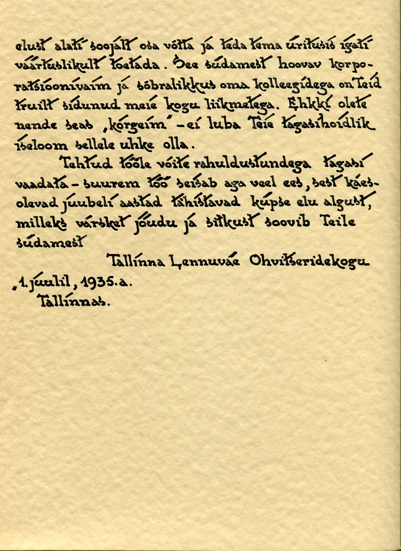 Kv. lendurvaatleja-kapten A.Kopvillemile Tallinna Lennuväe Ohvitseridekogu. 1925--1935. Kingituseks ilus suur dokumentide mapp koos tänukirjaga. Võibolla keegi oskab veel selle mehe, Tema elu ja saatuse kohta öelda.