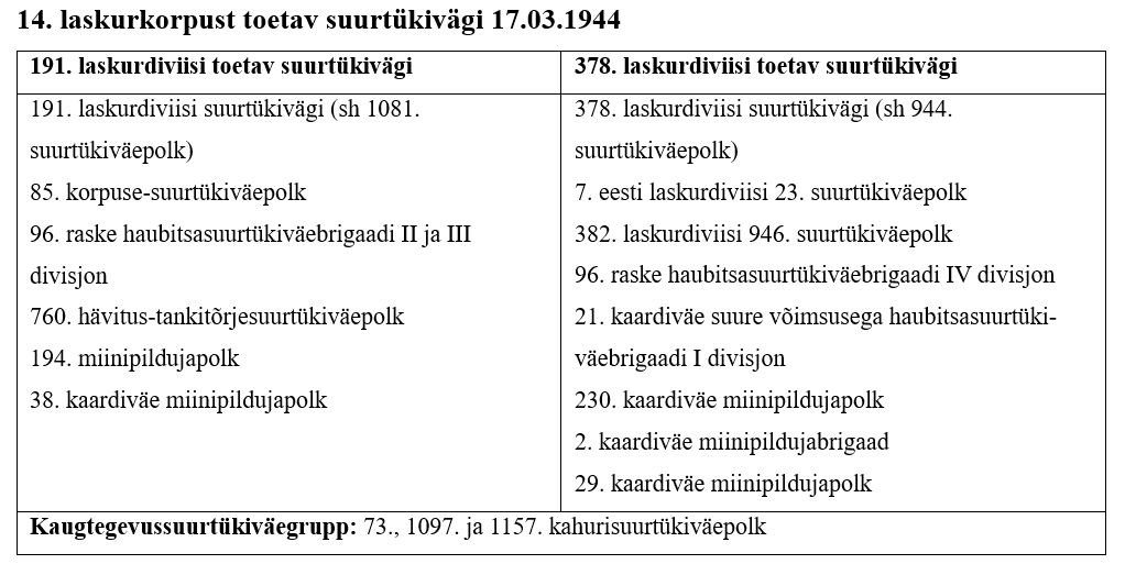 Kokku koos 382. diviisi suurtükiväega 186 suurtükki kaliibriga 76 mm kuni 203 mm ja 63 120 mm miinipildujat, peale selle veel 34 82 mm miinipildujat ja 22 45 mm tankitõrjekahurit. «Torude» koguarv oli Nõukogude poolel niisiis ümmarguselt 240, samal ajal kui vastaspoolel oli see arv ligi 140. Olgu mainitud, et 85. korpuse suurtükiväepolk pärines 8. eesti laskurkorpusest, kuid eestlasi oli selle koosseisus vähe. Nimetatud polk koos 1097. kahuripolguga moodustasid 14. korpuse kaugtegevussuurtükiväegrupi, mille peamine ülesanne oli võitlus vastase suurtükipatareide ja miinipildujatega. 382. diviisi ründealas asus Narva idakalda joone kaitsel 34. üksik kuulipilduja- suurtükipataljon koos sellele ajutiselt allutatud 1254. laskurpolgu (kuulus 378. laskurdiviisi koosseisu) I pataljoniga ning mõlemad olid antud 14. korpuse käsutusse. Täpsemalt oli tegu pataljonide riismetega (kokku oli neis kuni 260 inimest koos 23 kuulipilduja, kolme 45 mm tankitõrjekahuri ja nelja 82 mm miinipildujaga), mis asusid seal alates 6. märtsist, olles eelnevates lahingutes Vepsküla platsdarmi pärast suuri kaotusi kandnud. 382. diviisi