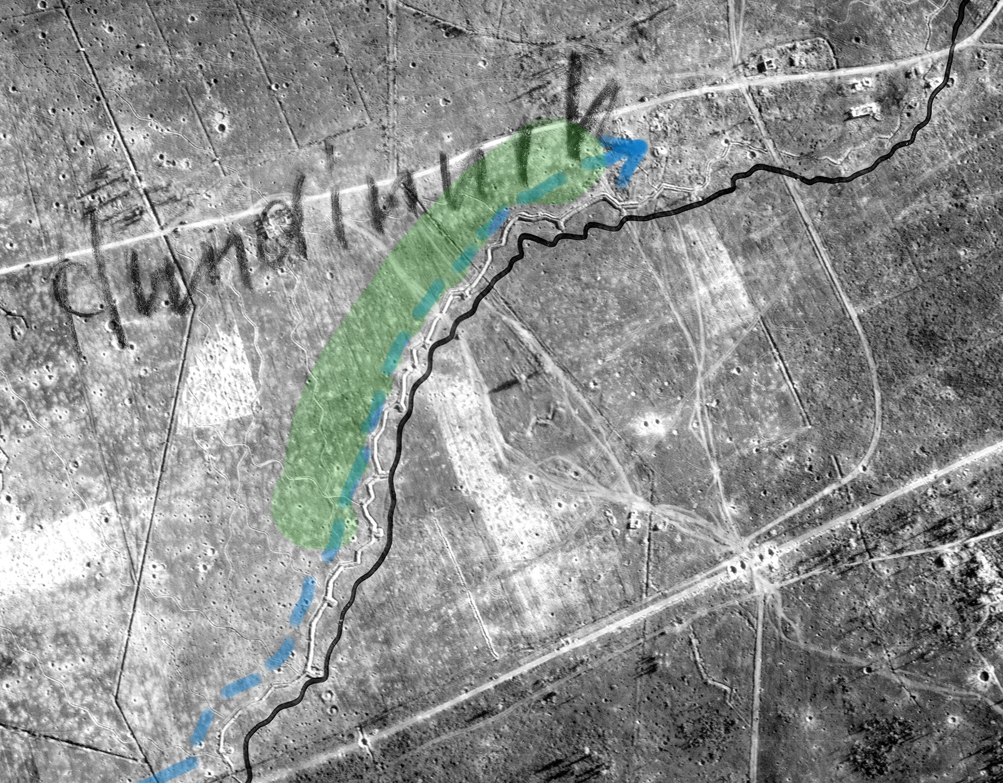 Aerofotol on sinisega märgitud füsiljeeride tulek rindelõiku ja rohelisega positsioonid, mida mehitati 1. augusti seisuga. Visnapuu hukkumiskoht peaks jääma Hundinurga külla, kuhu aga paigutada Oskar Ruudu langemiskoht.