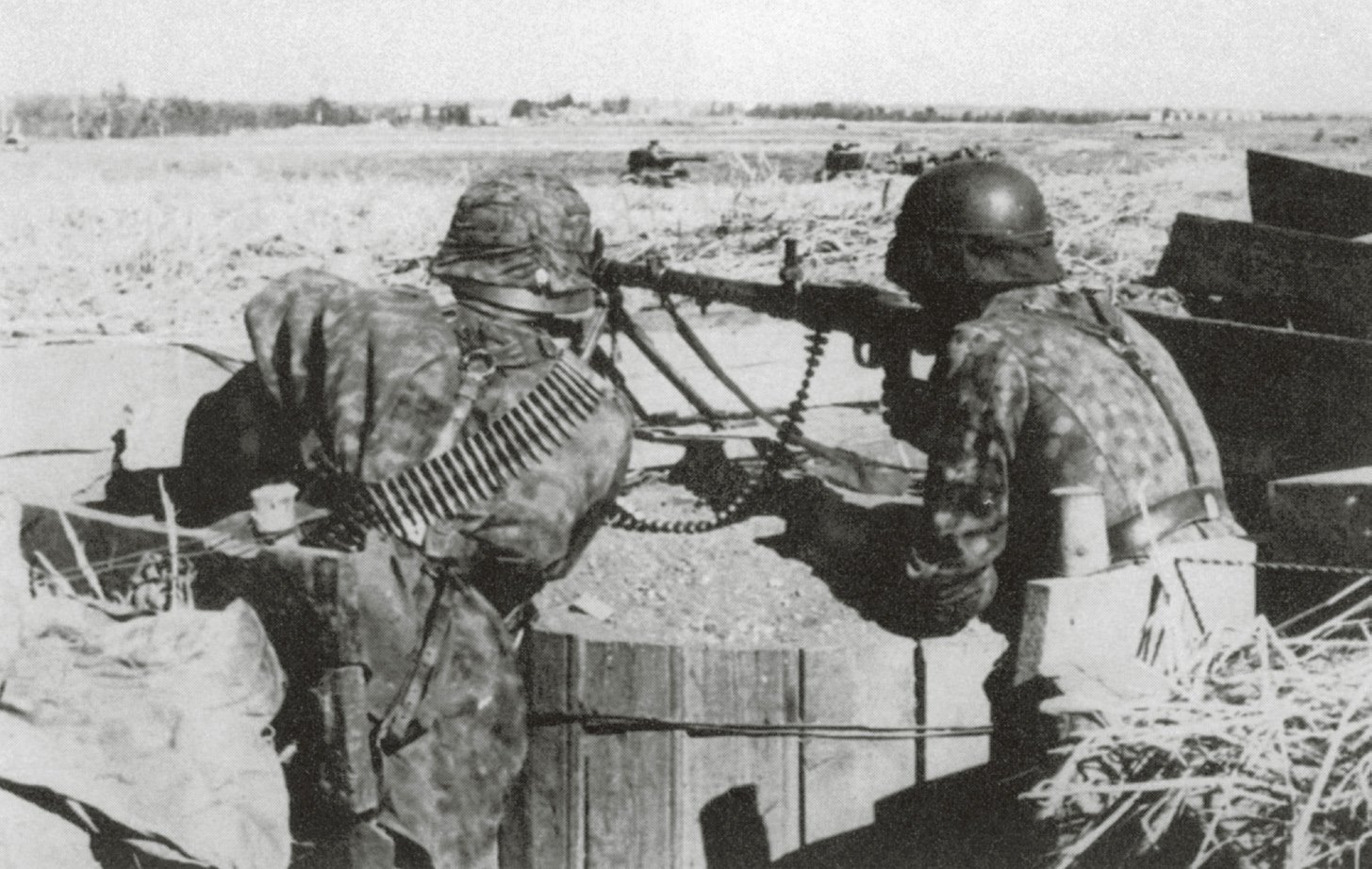 Veel üks ülesvõte enam-vähem samast kohast, kus eelmisel lehel näidatud Panzerfaust'i mees asus (kuulipildurid on PF-mehest mõned meetrid vasakul). Parempoolse sõduri kiivri taga on näha tankikolmik, millest keskmine tundub olevat vist tagumise otsa keeranud vaataja poole.