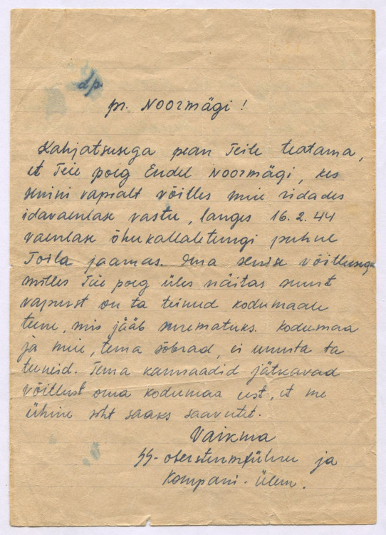 Lisan pildid 46. rügemendi 7. kompanii ülema Obersturmführer Edgar Vaikma kirjast, mis ta saatis Endel Noormägi vanematele.