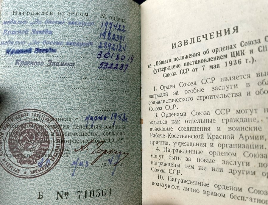 Sai ka Kuulsuse ordeni 3. järgu (532681) ja Punatähe ordeni aga need olid juba varem maha müüdud. Kuulsuse orden on tema ordeni raamatusse sisse kantud aga Punatähe orden on kirjas ainult hilisemas, 1958. aastal välja antud dokumendis. Punatäht ei tule välja ka Podvig Naroda andmebaasist. Kuulsuse orden numbriga 532681 äkki mõne foorumlase kollektsioonis?