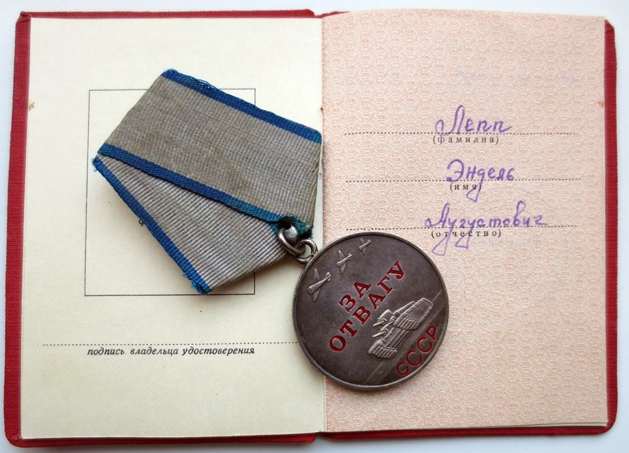 249. Laskurdiviisi 917. laskurpolgu reamees, laskur Endel Lepp. Sai Vapruse medali nr. 34426995 1943.a Velikije- Luki lahingutes raskelt haavatasaamise eest. Medal anti talle kätte peale sõda.