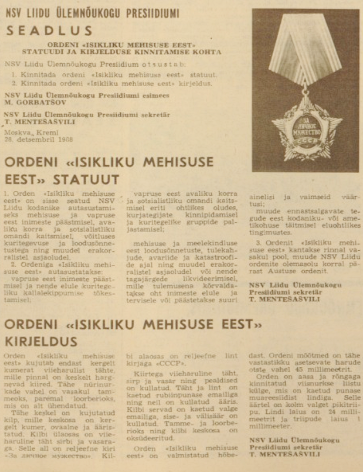 Re: NSVL orden ''Isikliku mehisuse eest''.