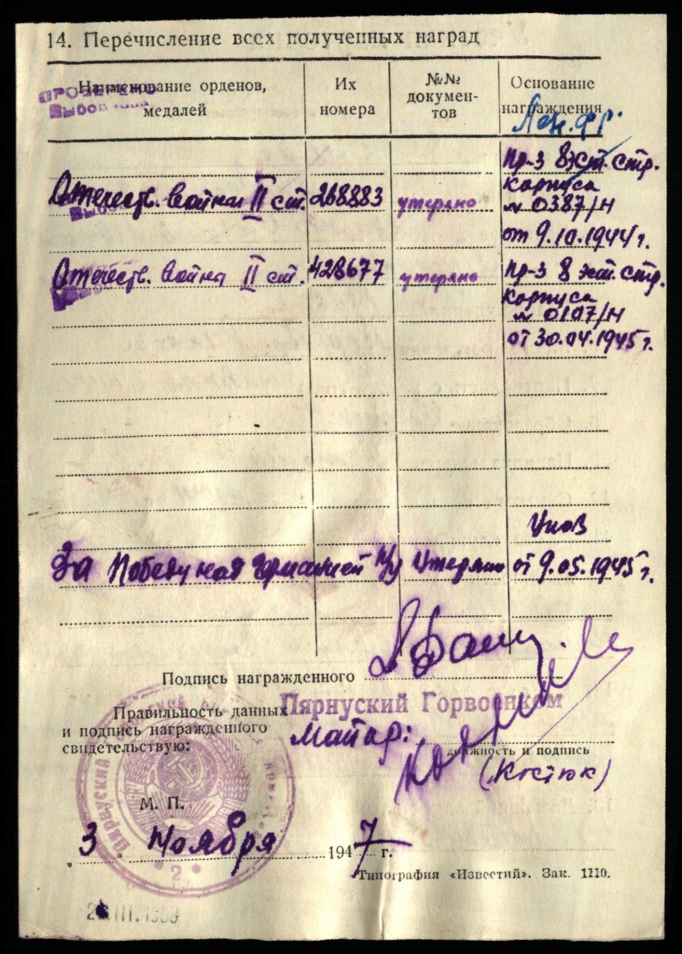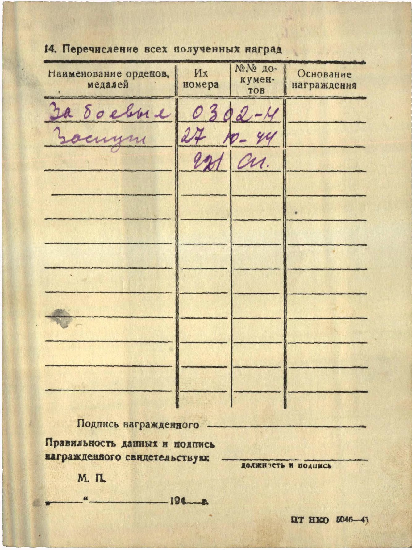 Eelmise postituse medalite autasulehed, kiire tõlge: