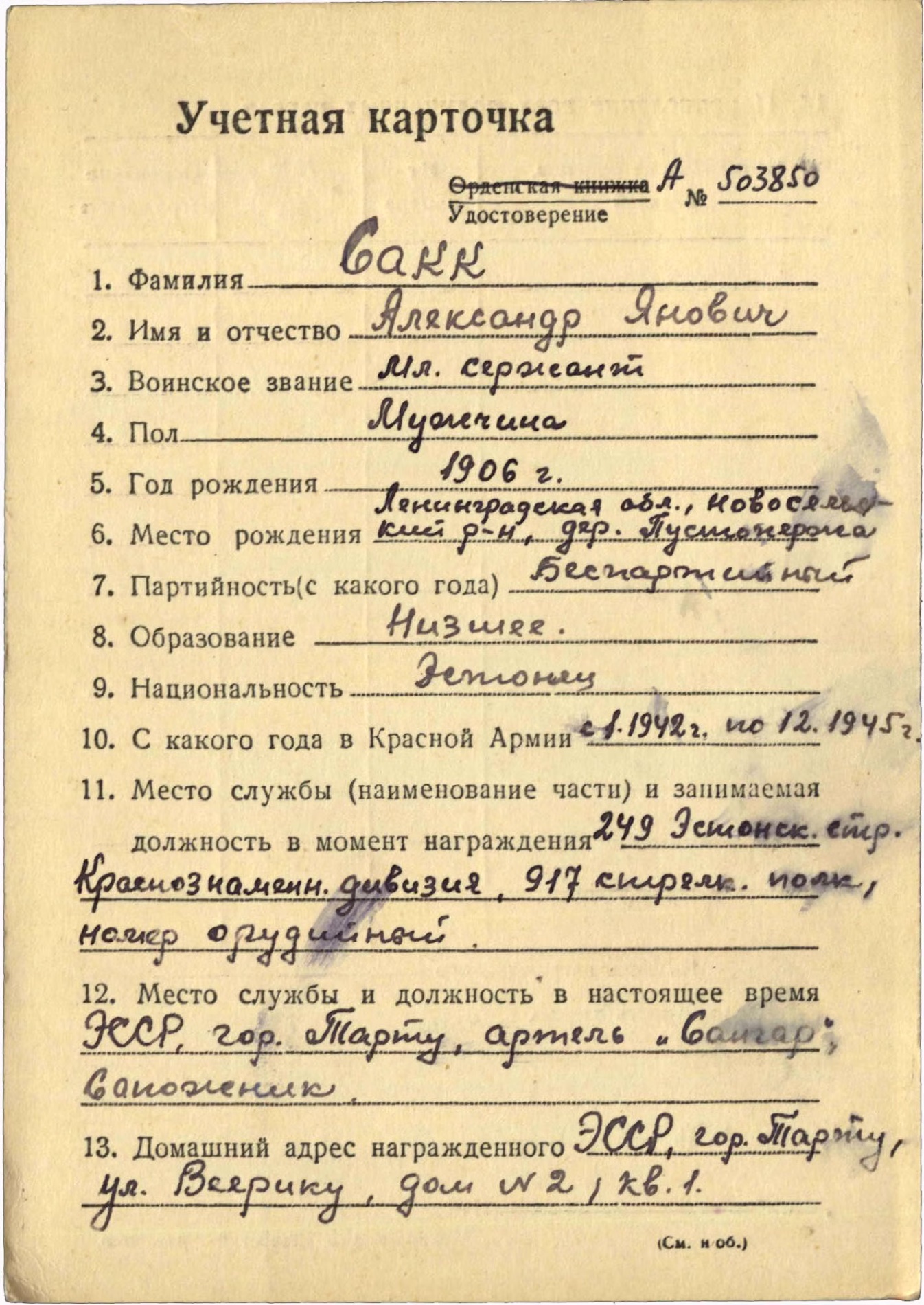 Korpusepoiss Aldo Jaano? 249. Laskurdiviis, 779. Suurtükiväepolk. Punaarmees alates 1942. Lahinguteenete medali ja punatähe ordeni kavaler
