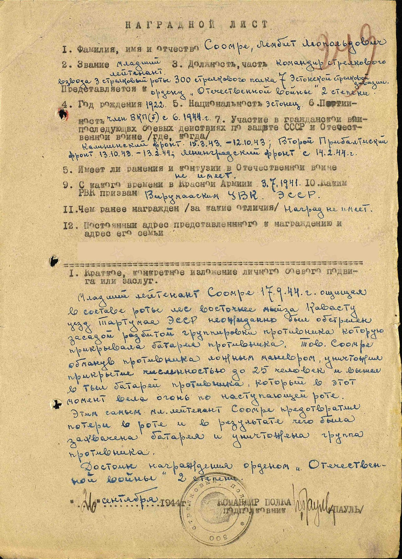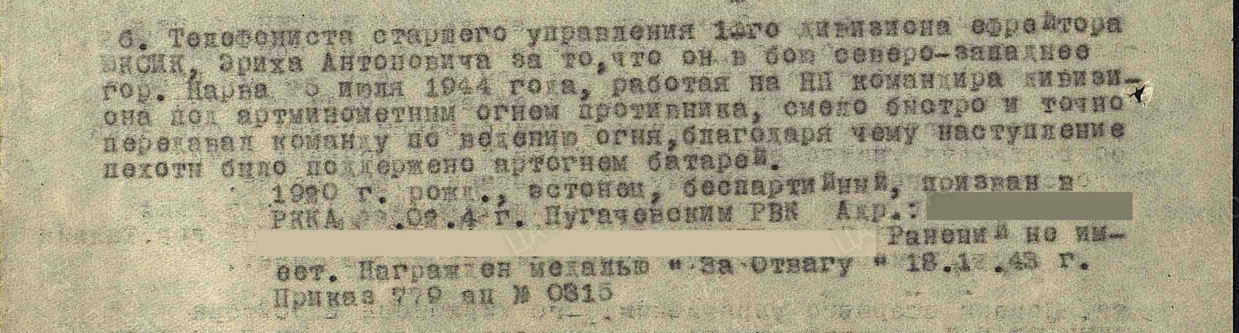 Perekonnanimeks on Üksik! Nüüd kuskilt foorumist kunagi üles korjatud fotod- vanemseersant Eduard Koov, 8. Eesti laskurpolgu üksiku karistussalga 4. rühma rühmakomandori abi. Vapruse medali 164961 kavaler. Medal saadud Brjuhnõ? küla ja Velikije- Luki lahingutes, kus 16.01.1943 kindlakäeliselt juhtis 4. rühma võitlejaid, sattusid vaenlase pommitamise alla. Hoolimata sellest, et ta ise sai raskelt põrutada, juhtis Koov oma rühma haavatud sõdurite evakueerimist, kusjuures ise lasi ennast lahinguväljalt ära viia viimasena.kepsuke kirjutas: ↑E Apr 14, 2025 5:47 pm Korpusepoiss Erich Juksik? 249. Laskurdiviis, 779. Suurtükiväepolk.