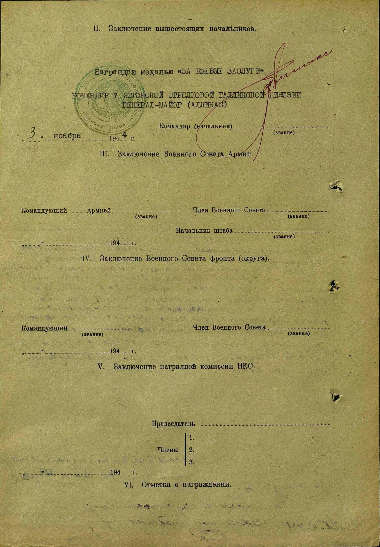 Autasuleht umbes nii: 19. oktoober 1944 pidi reamees Alfred Erm Sõrve poolsaarel 10 minuti jooksul vaenlase miinipilduja tule all toimetama käsu ????. Seda tegi ta vapralt ja ajaliselt. Esitati VM, aga sai LT. Huvitav, et ta on märgitud hukkunute nimekirja VL lahingu ajal.