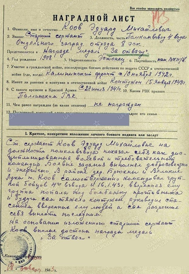 Tänud, parandus tehtudtossom kirjutas: ↑T Apr 15, 2025 2:18 pmPerekonnanimeks on Üksik! Nüüd kuskilt foorumist kunagi üles korjatud fotod- vanemseersant Eduard Koov, 8. Eesti laskurpolgu üksiku karistussalga 4. rühma rühmakomandori abi. Vapruse medali 164961 kavaler. Medal saadud Brjuhnõ? küla ja Velikije- Luki lahingutes, kus 16.01.1943 kindlakäeliselt juhtis 4. rühma võitlejaid, sattusid vaenlase pommitamise alla. Hoolimata sellest, et ta ise sai raskelt põrutada, juhtis Koov oma rühma haavatud sõdurite evakueerimist, kusjuures ise lasi ennast lahinguväljalt ära viia viimasena.kepsuke kirjutas: ↑E Apr 14, 2025 5:47 pm Korpusepoiss Erich Juksik? 249. Laskurdiviis, 779. Suurtükiväepolk.