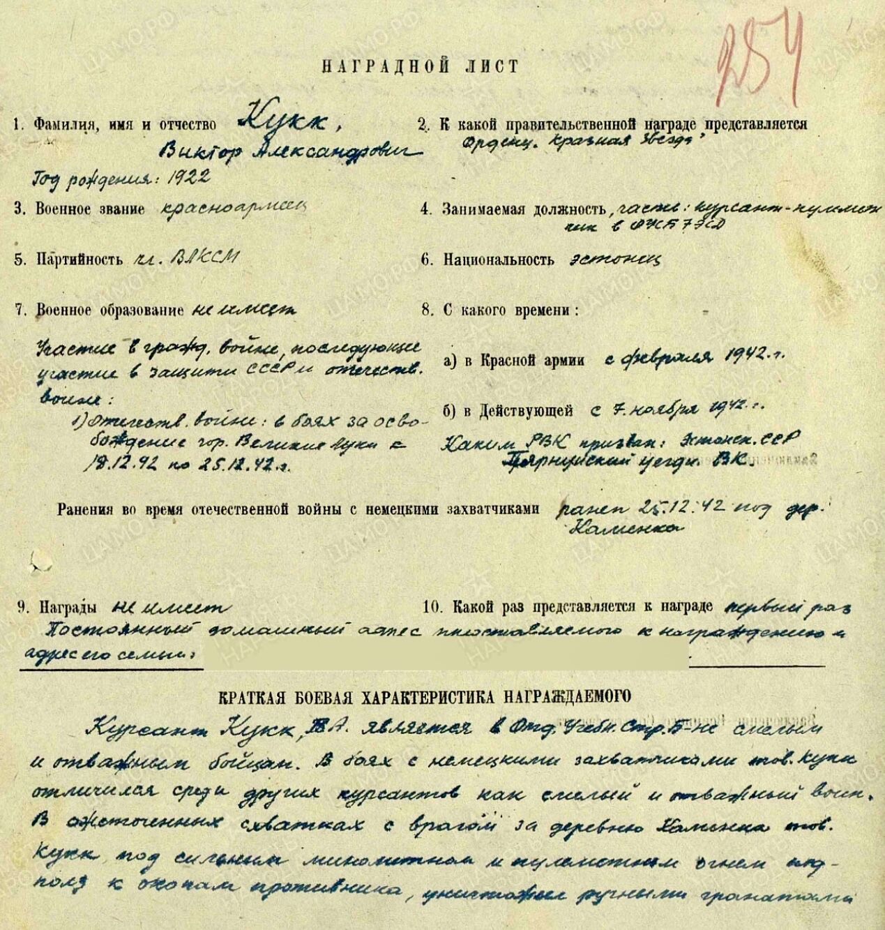 Korpusepoiss Viktor Kukk, 7. Eesti Laskurdiviis, 27. Laskurpolk. Punaarmees alates 1942. Punatähe ja Kuulsuse III järgu ordeni kavaler. Haavata saanud kaks korda.
