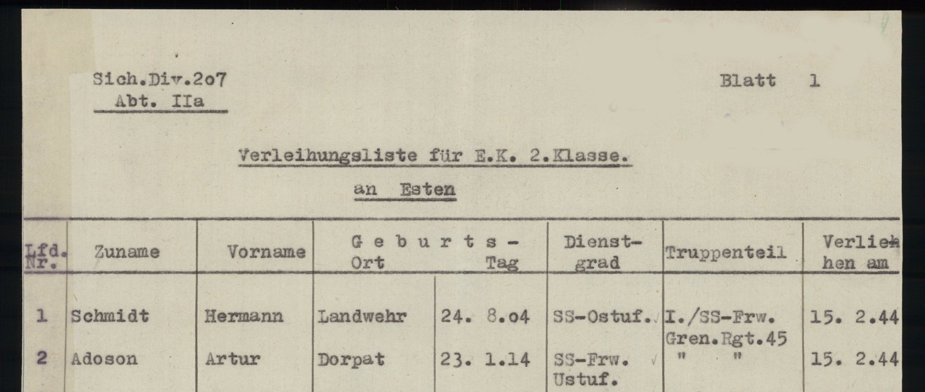 Tema EK2 annetamise dokumenti ei ole õnnestunud arhiivist leida aga EK1 oma on täitsa olemas kuigi eksitud on auastmega, Obersturmführer'i asemel on ta kirja läinud kui Oberscharführer.