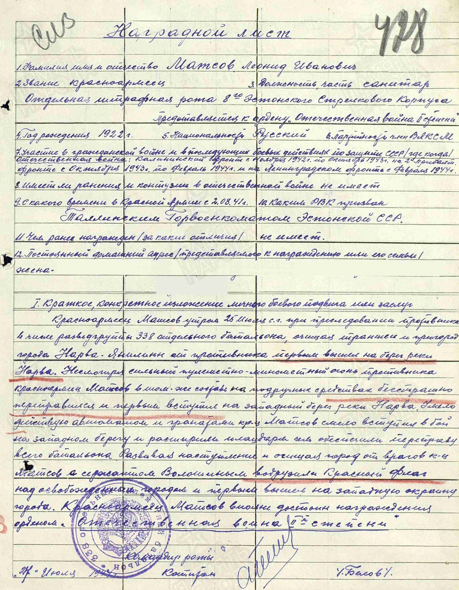 1941. aasta 2. juulil Tallinnast Punaarmeesse mobiliseeritud Matsov'i autasustati kokku nelja lahinguautasuga ja esitati Nõukogude kangelase nimetuse saamiseks. Nendest esimese, Kuulsuse ordeni III järgu sai ta 1944. aasta 25. juuli lahingute eest, kus ta oma üksusega üle Narva jõe tuli ja linna "vabastas". Ei saa öelda, et ma Eesti Laskurkorpuse sõjateega peensusteni kursis oleksin aga mul oli teadmine, et korpuse jalaväeosad üldse sealt üle jõe ei tulnud ja Narva lahingust võtsid osa ainult suurtükiväeosad. Matsov'i osalus selles pani mind natuke raamatuid lehitsema ja leidsin, et vahetult enne jõe forsseerimist oli Eesti Laskurkorpusest antud üks rünnakrood 338. eraldiseisva kuulipilduja - ja suurtükipataljoni alluvusse. Ööl vastu 25. juulit avastas roodust välja saadetud luurerühm vanemleitnant Harald Horm'i juhtimisel, et sakslased on eesmisi kaevikuid maha jätmas ja kella kahe paiku öösel jõudis rühm Jaanilinna juures Narva jõeni. Nagu on teada siis 25. juuli hommikul forsseerisid Punaarmee 2. löögiarmee üksused Narva jõe, keskpäeval üritasid seda teha ka 16. kindlustatud rajooni allüksused, mille koosseisus oli ka 338. pataljon aga ebaõnnestusid. Uus katse võeti ette ööl vastu 26. juulit ja Harald Horm'i rühm oli esimene, kes jõe läänekaldale jõudis. Nende lahingute eest eest antigi Matsovile Kuulsuse ordeni III järk (19360). Autasustamisdokumendis on kirjas, et Matsov tegutses üksuses sanitarina ja aitas miinipildujatule all haavatuid kaaslasi evakueerida ja andis neile esmaabi. Päästis mitme võitluskaaslase elu.