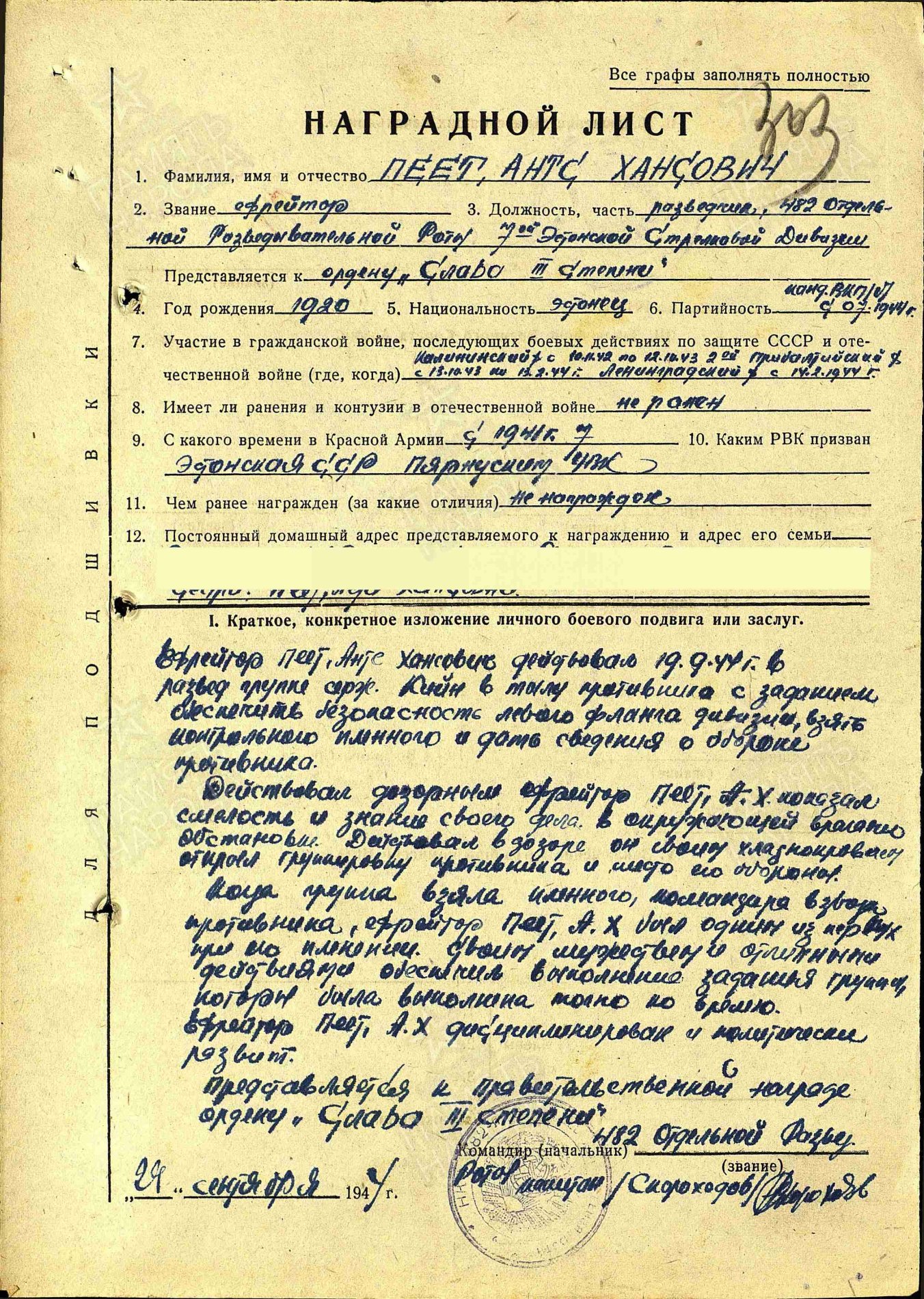 Jefreitor Ants (Hans) Peet, luuraja, 7. Eesti Laskurdiviisi 482. üksik luurerood. Kuulsuse III klassi ordeni nr. 172597 kavaler. Kuskilt lugesin, et pärast sõda töötas Peet muuhulgas ka kolhoosiesimehena, tubli töö eest anti talle 1958. aastal kui erinevaid autasusid sai suur hulk põllumajandustöötajaid, orden ’’Austuse märk’’ nr. 257609.