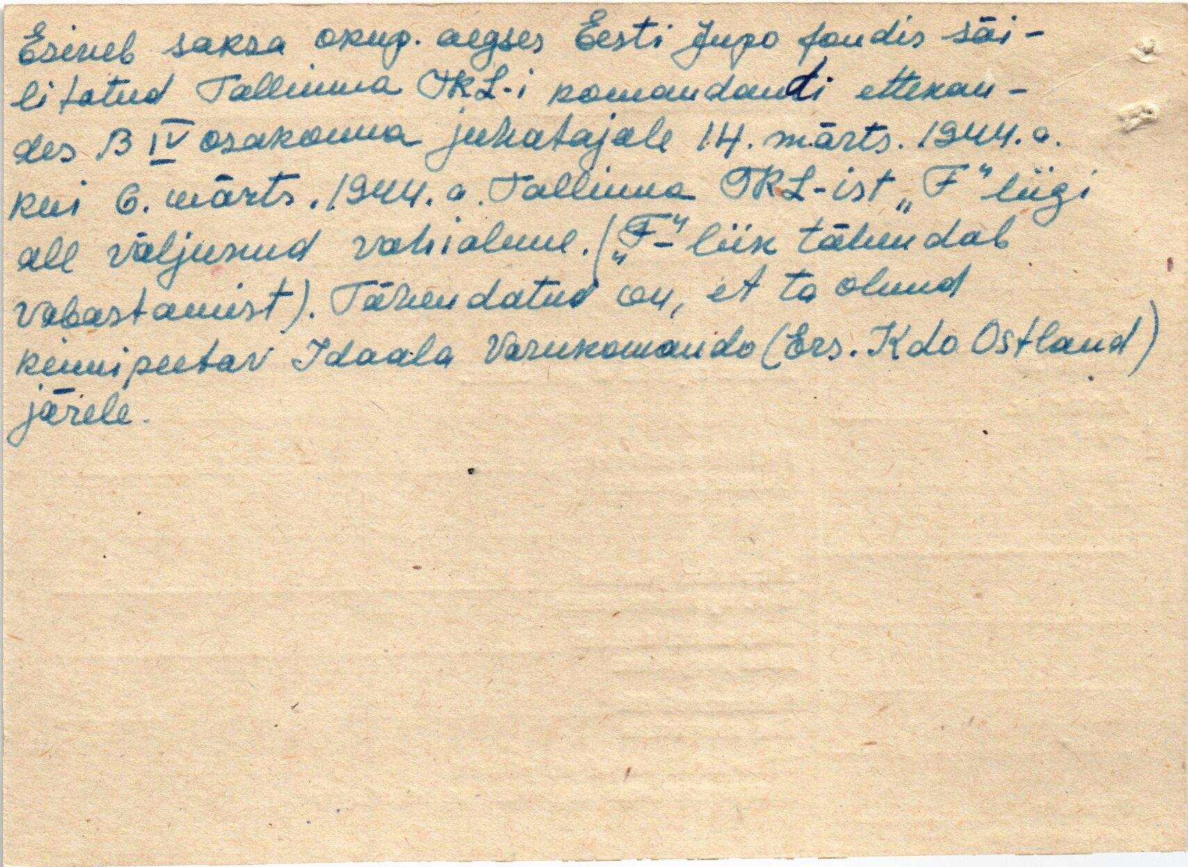 Teenis 1944 46. rügemendi staabis nagu selgub tema mälestustest: Kukk, Hans. Sõjarindelt pagulusse. // Korporatsioon Fraternitas Estica 1907-1982. Toronto, 1983