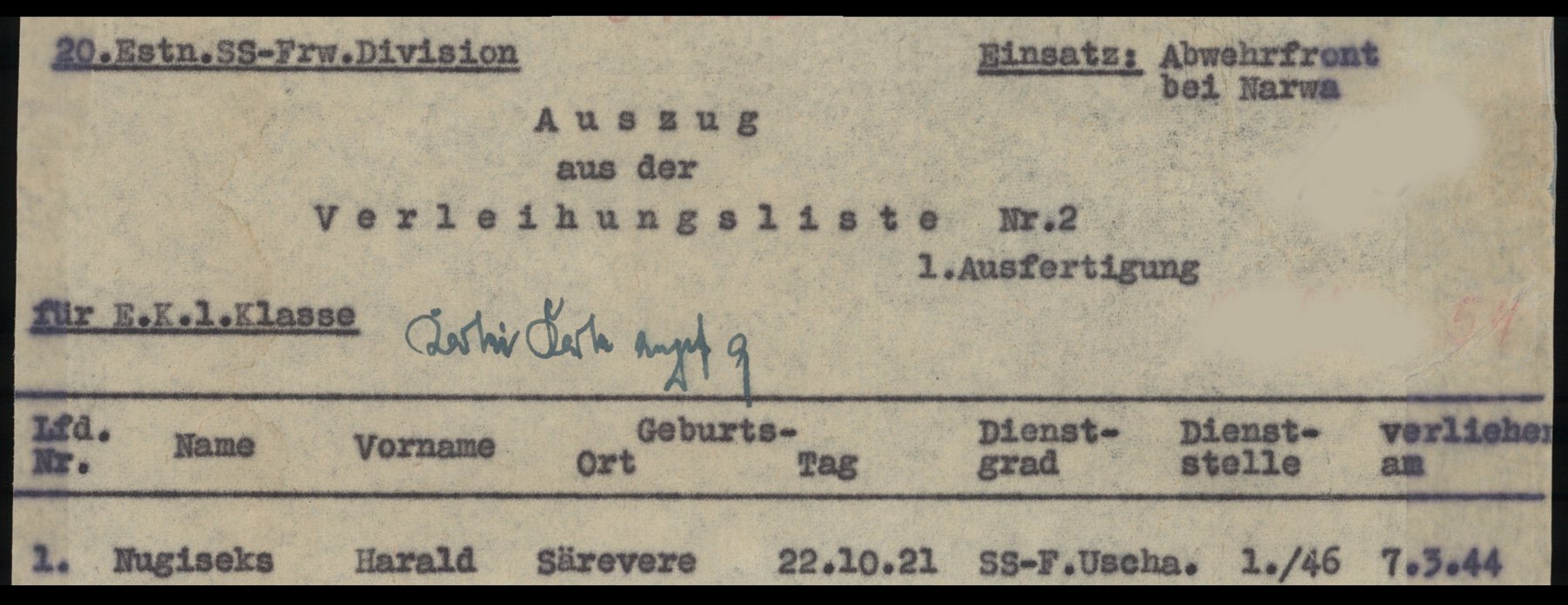 Tema EK2 annetamise dokumenti ei ole õnnestunud arhiivist leida aga EK1 oma on täitsa olemas kuigi eksitud on auastmega, Obersturmführer'i asemel on ta kirja läinud kui Oberscharführer.