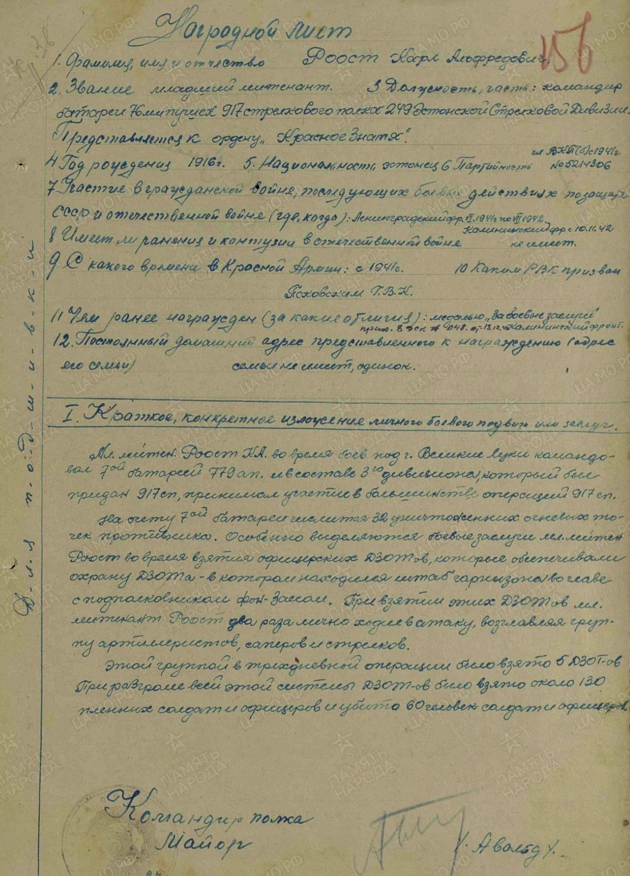 kepsuke kirjutas: K Mai 07, 2025 2:52 pm Korpusepoiss Karl Roost. 917. Laskurpolk, 249. Laskurdiviis. Punarmees alates 1941. Lahiguteenete,Punatähe ja Isamaasõja ordeni(II) kavaler. Teada vaid punatähe number 113622, saadud Luki lahingus