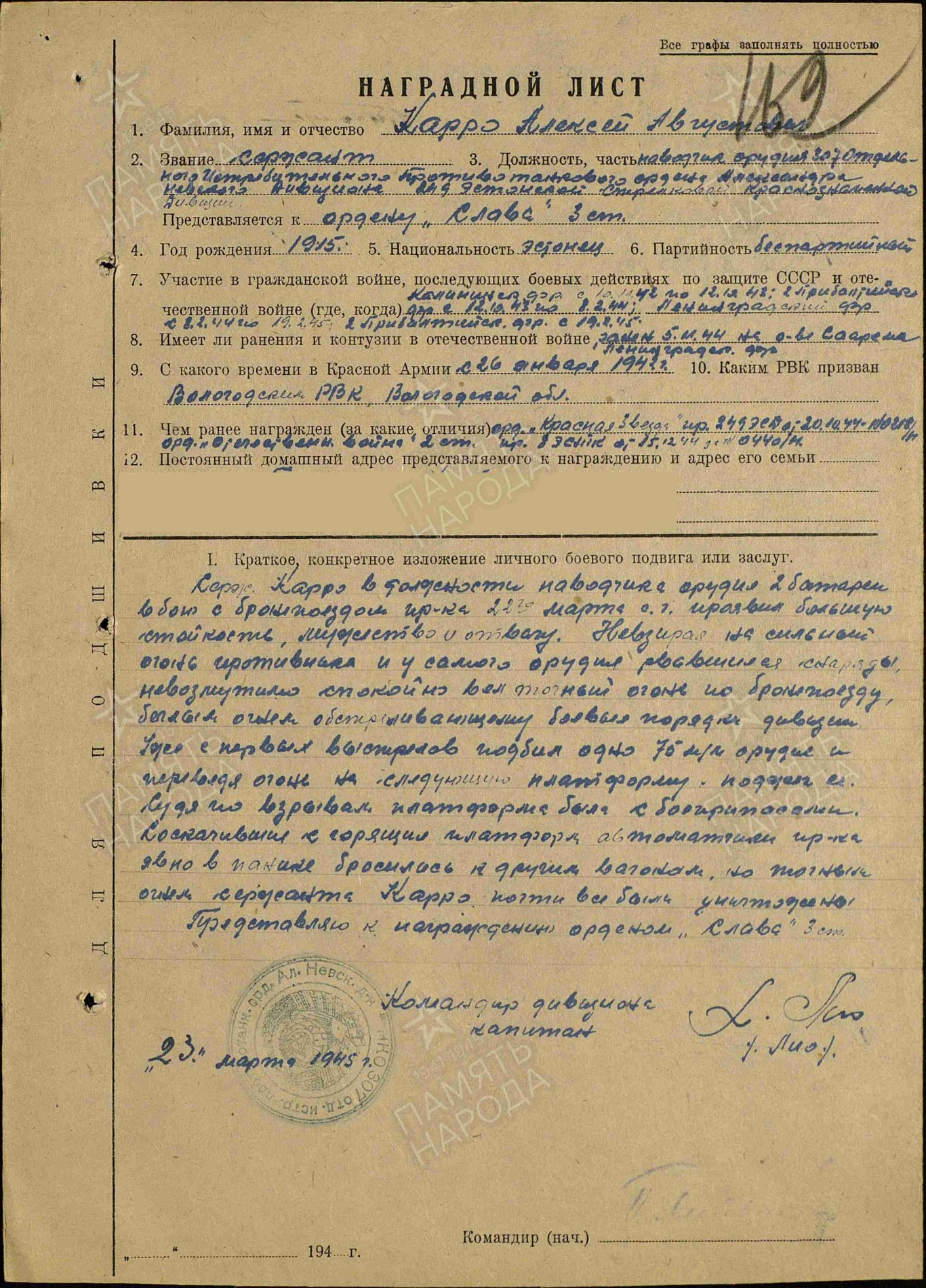 Nooremseersant Aleksei Karro, 249. Eesti Laskurdiviis, 307. Üksiku tankitõrjedivisjoni 2. patarei relvakomandör. Tehumardi lahingu eest saadud Isamaasõja 2. klassi ordeni nr. 268845 kavaler. Karro on saanud veel Punatähe ordeni nr. 1151824 (Emajõe forsseerimine septembris 1944.a) ja Kuulsuse III klassi ordeni nr. 464935 (Kuramaa lahingud).