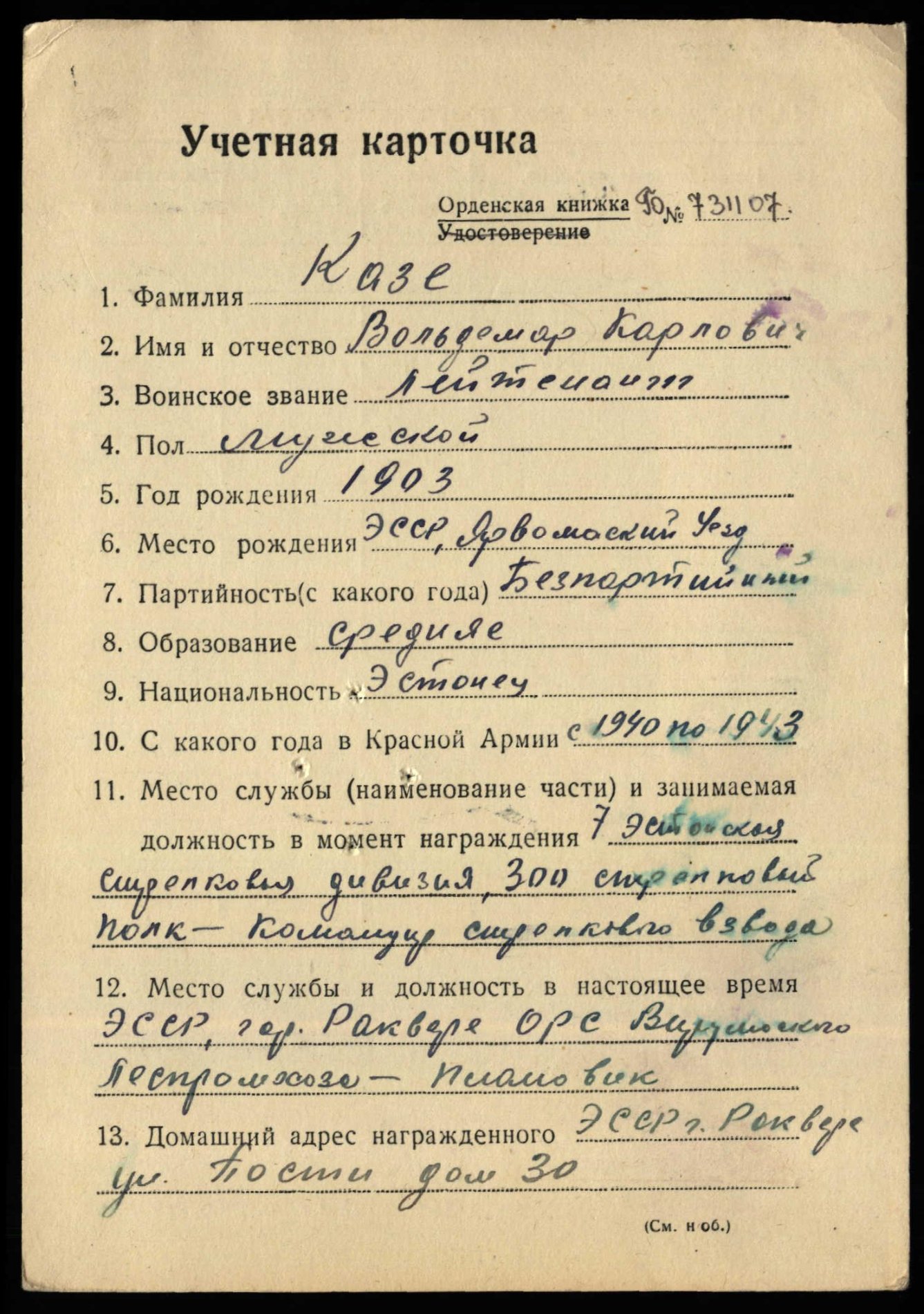 Leitnant Voldemar Kase, 7. Eesti laskurdiviisi 300. laskurpolgu laskurrühma komandör. Vapruse medali nr. 135176 ja Punatähe ordeni nr. 1889891 kavaler.