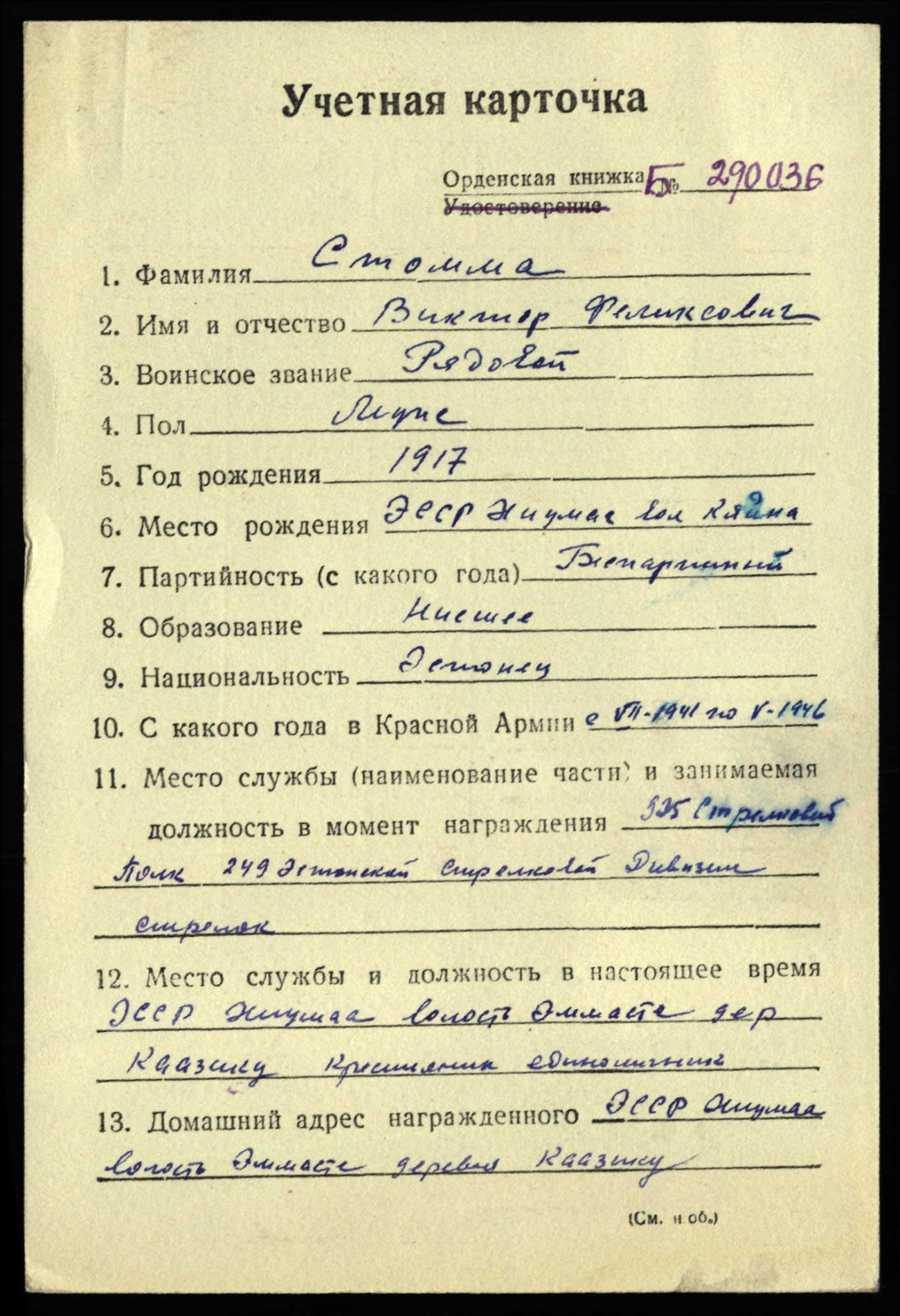 Saaremaa lahingud jah. Kavaleriks 249.Laskurdiviisi 779. suurtükiväepolgu 6. patarei punaarmeelane Viktor Stomma, III klassi Kuulsuse ordeni nr. 218619 kavaler.