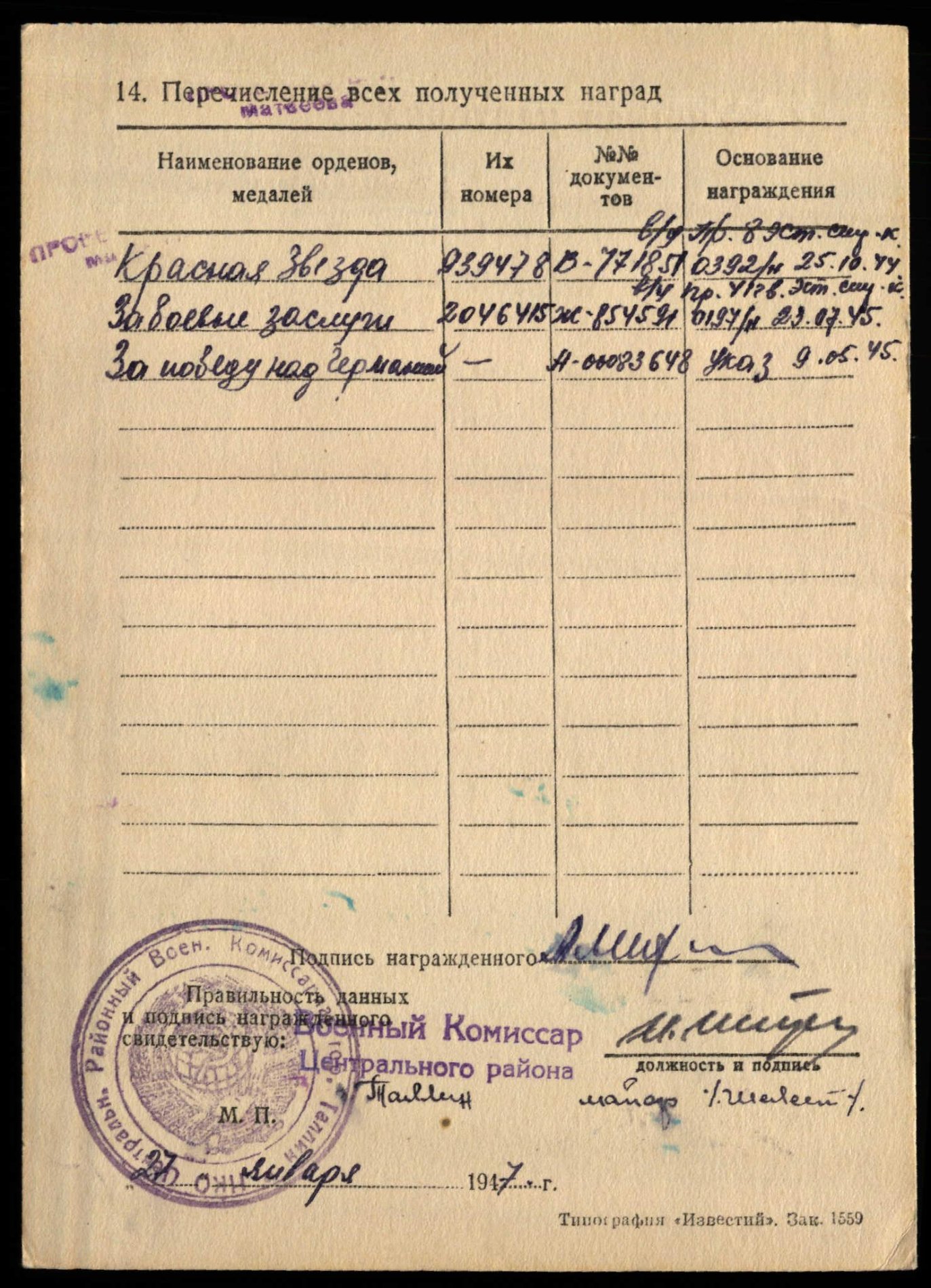 tossom kirjutas: K Apr 13, 2016 9:48 pm Ja täna saadud kena paar, kuulunud ühele inimesele, nime ei osatud küll kahjuks öelda. Varasem täht on numbriga 1480688 ja see sobib kenasti meie 1 480 *** andmebaasi. Hilisem on numbriga 3536526. Ilmselt tegu korpuse ohvitseriga, kes teenis punaarmee ridades ka mõnda aega pärast sõda. Hilisema Punatähega autasustamise ajaks on viiekümnendate aastate keskpaik.