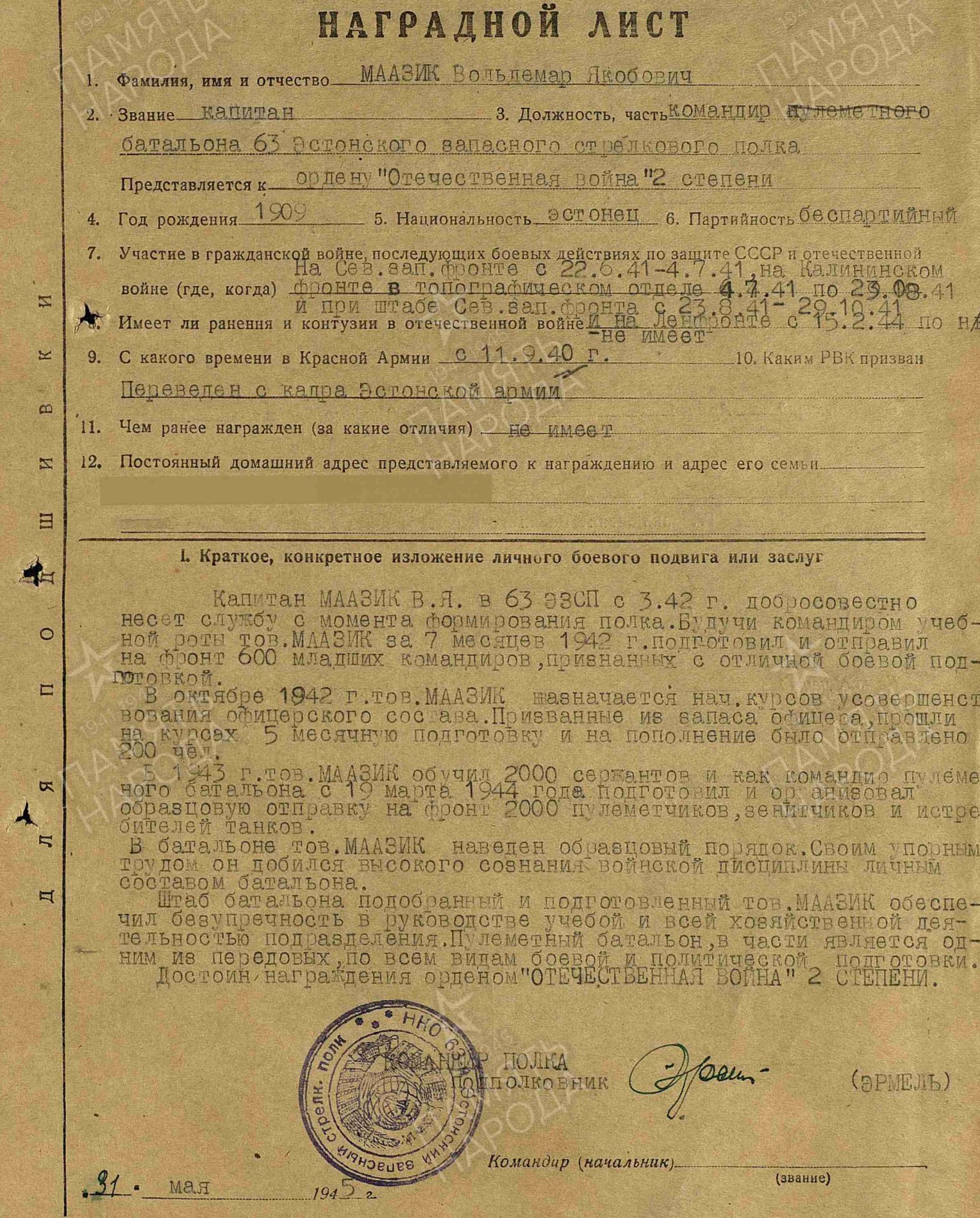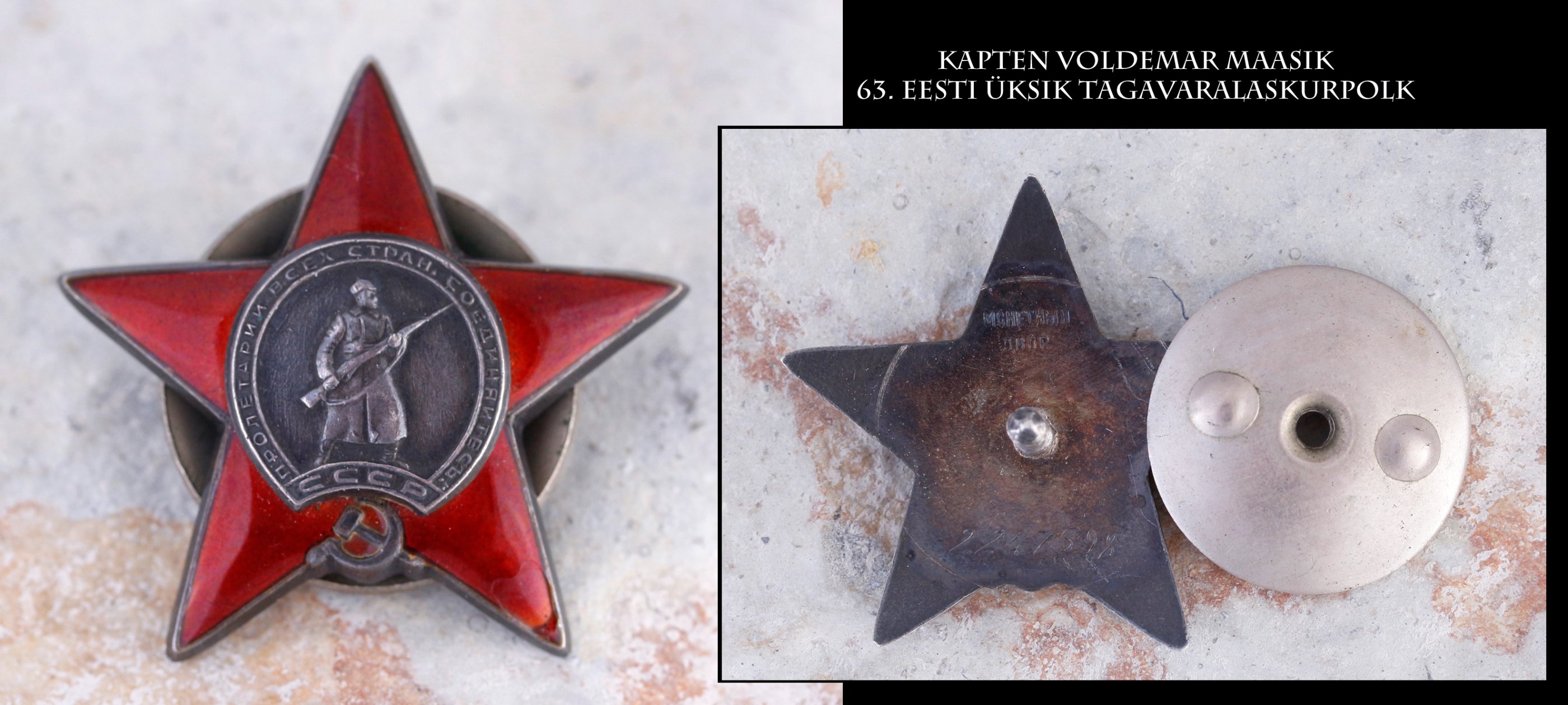8. Eesti laskurkorpuse tagavarapolgu pataljoniülema, kapten Voldemar Maasik'u Punatähe orden (2247598). Tegemist on endise Eesti sõjaväe ohvitseriga, kes enne sõda teenis sõjavägede staabi juurde kuuluvas topo-hüdrograafia osakonnas. Punatähe orden annetati talle 1945. aasta mais, lisan tõlke autasulehelt: