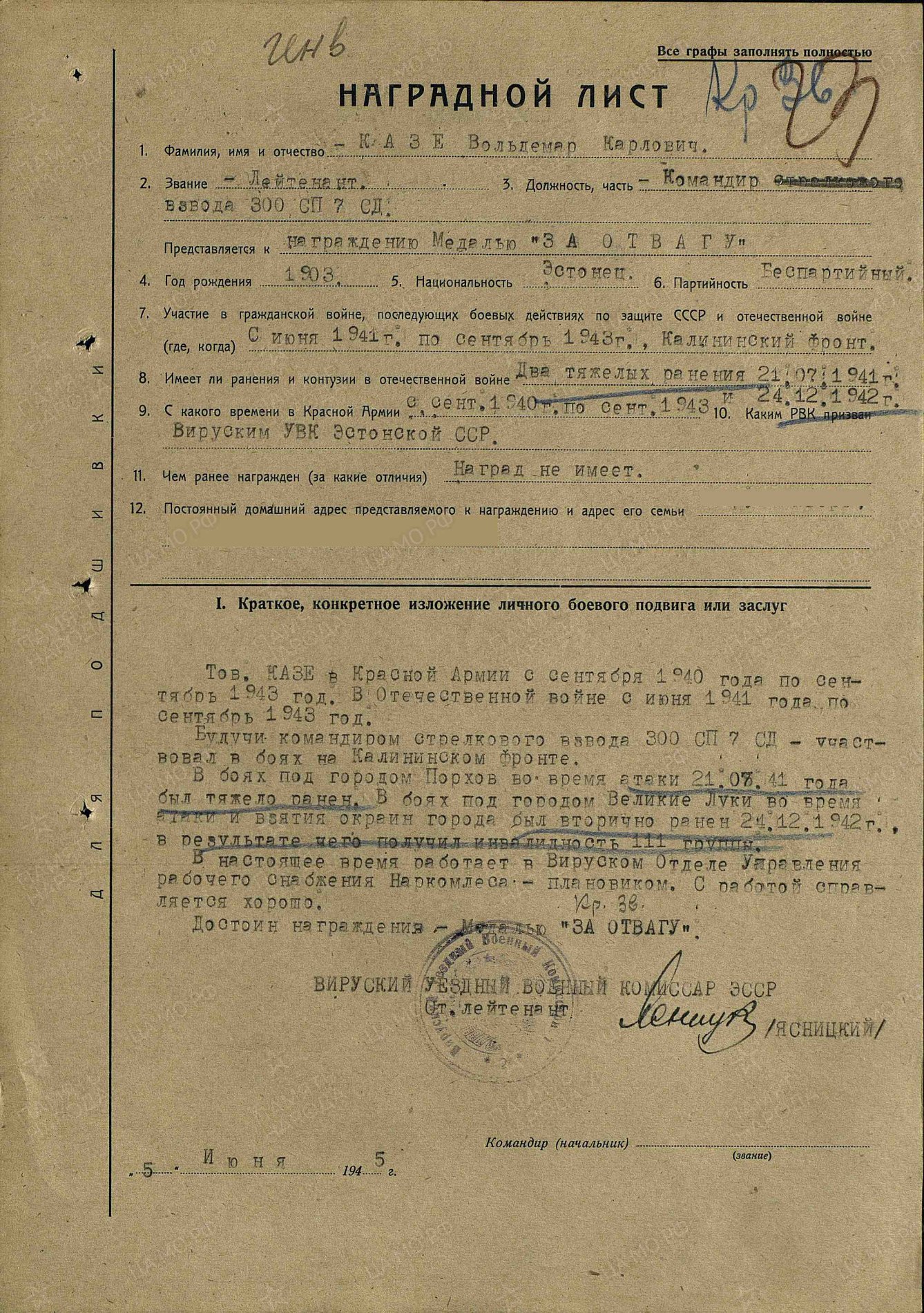 Leitnant Voldemar Kase, 7. Eesti laskurdiviisi 300. laskurpolgu laskurrühma komandör. Vapruse medali nr. 135176 ja Punatähe ordeni nr. 1889891 kavaler.