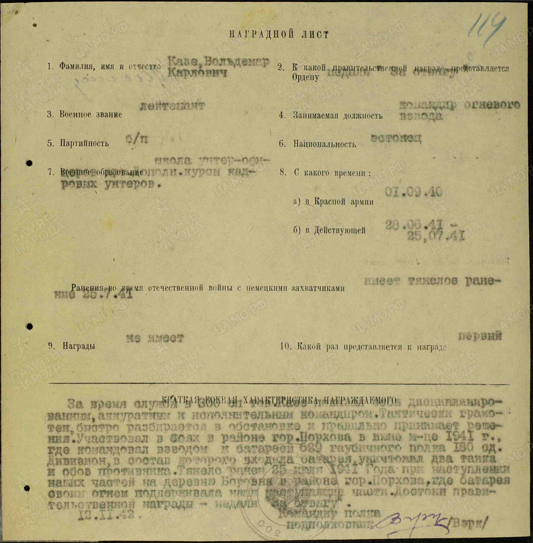 Teenistuse ajal 300. laskurpolgus näitas end täpse ja distsiplineeritud komandörina. Taktikaliselt arukas, reageerib kiirelt erinevates olukordades ja võtab vastu õigeid otsuseid. Juunis 1941.a osales rühmakomandörina lahingutes Porhovi linna juures kus juhatas 180. laskurdiviisi 629. suurtükiväepolgu haubitsapatareid. Diviis, mille juurde patarei kuulus hävitas kaks vaenlase tanki ja midagi veel (ei saa aru mis see on). 25.07.1941.a sai Porhovi rajoonis asuva Borovnja? küla juures kus haubitsapatarei toetas tulega edasi tungivaid vägesid, raskelt haavata.