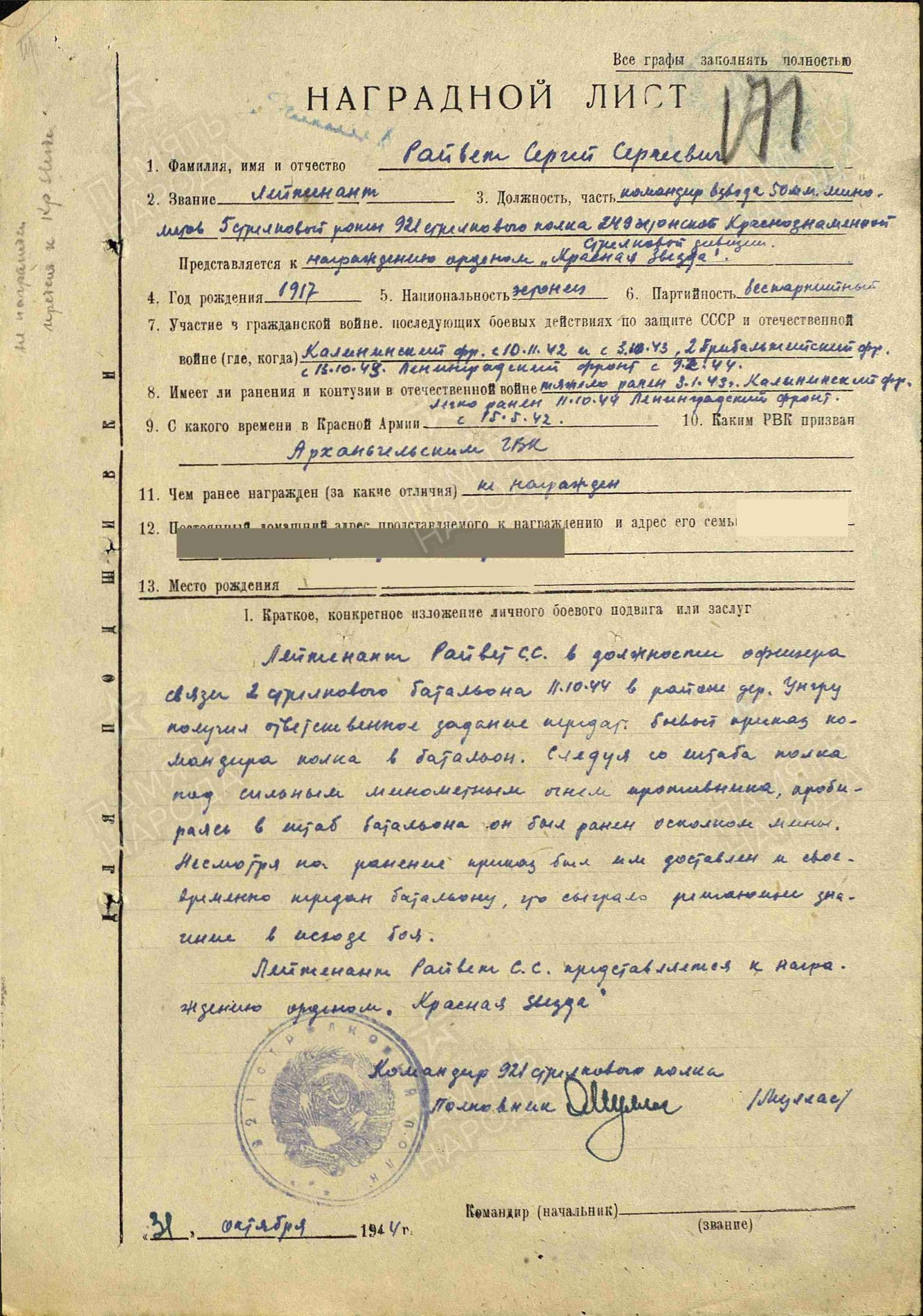 Kapten Sergei Raivet, 249. Eesti Laskurdiviisi, 921. laskurpolgu, 5. laskurroodu 50mm miinipildujate rühmakomandör. Punatähe ordeni nr. 1480688 kavaler. Lisaks on teda autasustatud veel ühe Punatähe ordeniga, mis kannab numbrit 3536526 ja ilma numbrita Lahinguteenete medaliga. Viimased kaks autasu on ilmselt antud Punaarmees väljateenitud aastate eest.