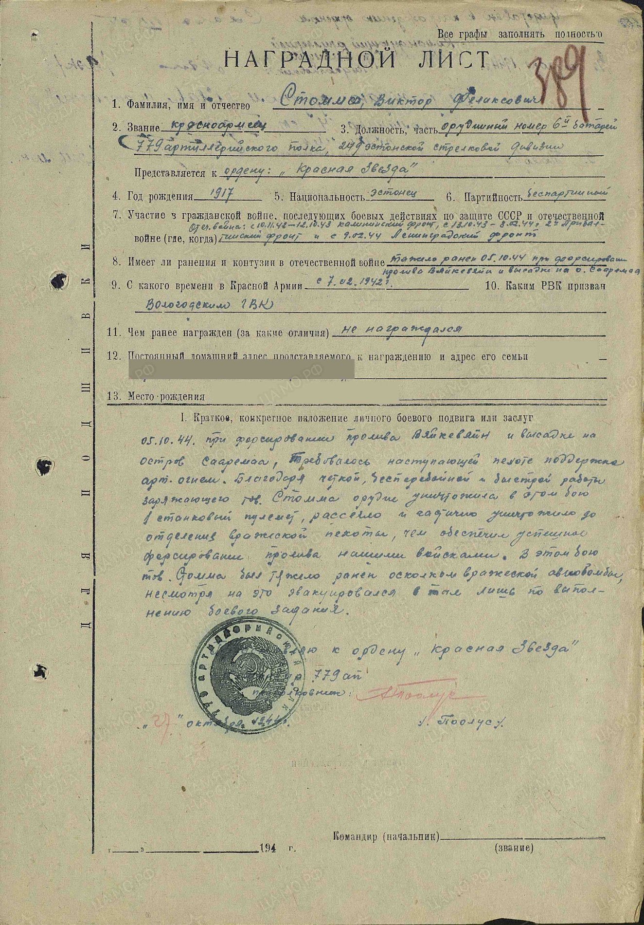 Saaremaa lahingud jah. Kavaleriks 249.Laskurdiviisi 779. suurtükiväepolgu 6. patarei punaarmeelane Viktor Stomma, III klassi Kuulsuse ordeni nr. 218619 kavaler.