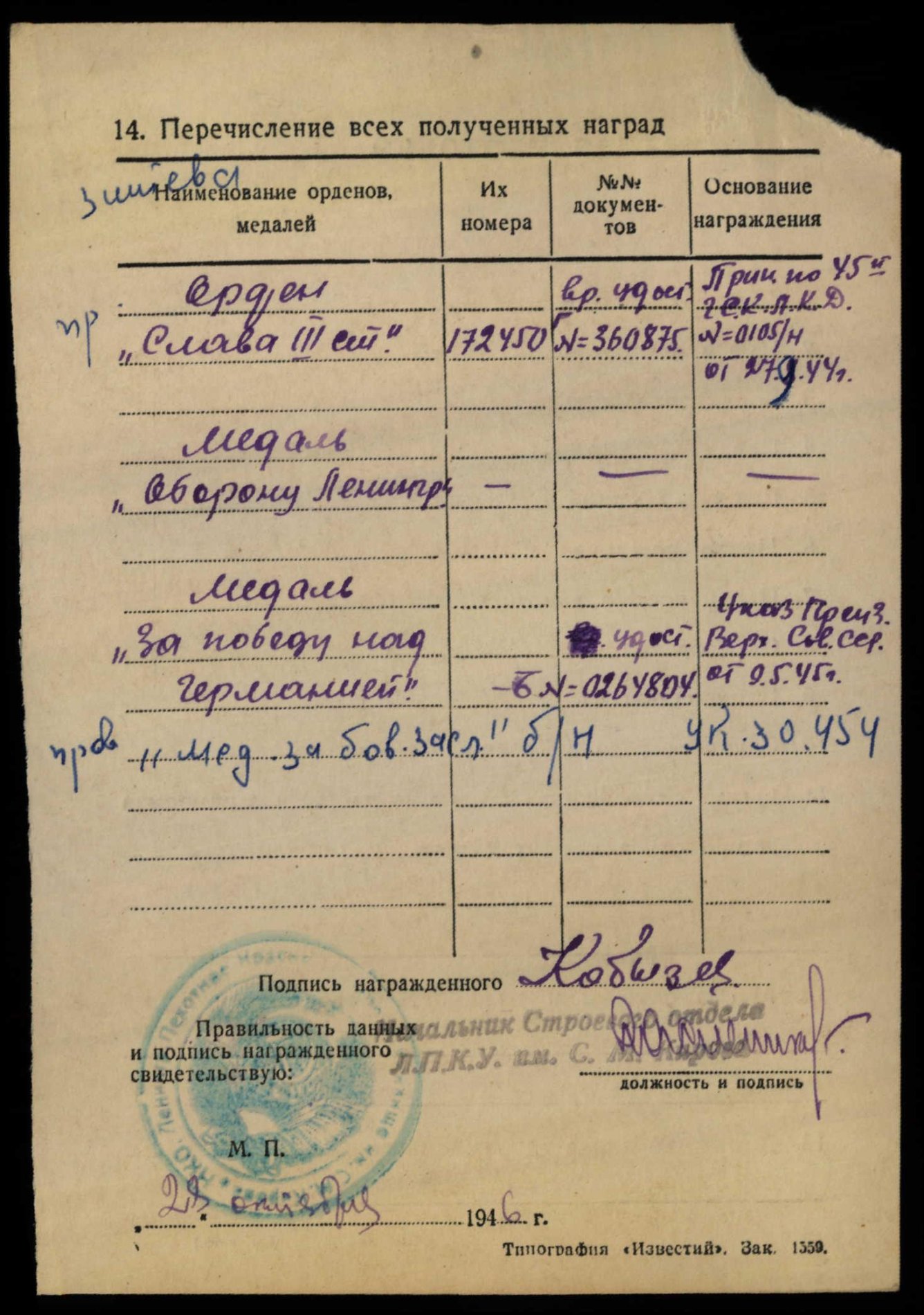 428465, kapten Pavel Pronitsev- Leningradi korpuse 135. üksiku sidepataljoni staabiroodu komandör. Orden saadud lahingutegevuse eest Leningradi ümbruses.