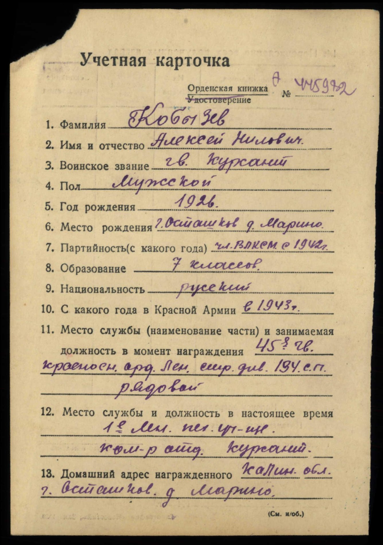 Leitnant Voldemar Kase, 7. Eesti laskurdiviisi 300. laskurpolgu laskurrühma komandör. Vapruse medali nr. 135176 ja Punatähe ordeni nr. 1889891 kavaler.
