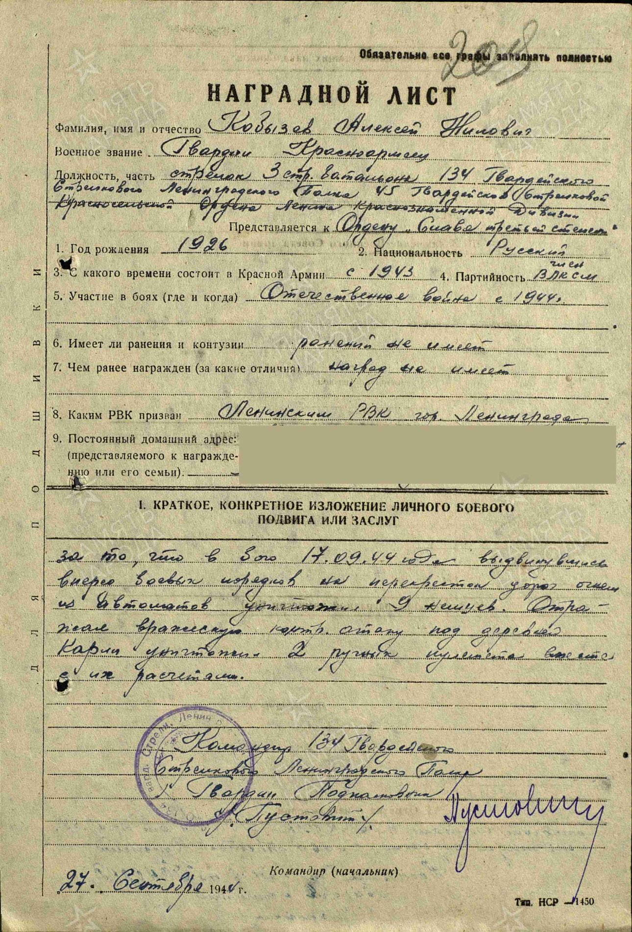 428317, leitnant Pavel Bojarshinov, 45.Laskurdiviisi 129.laskurpolgu rühmakomandör. Orden saadud lahingute eest Lätis.