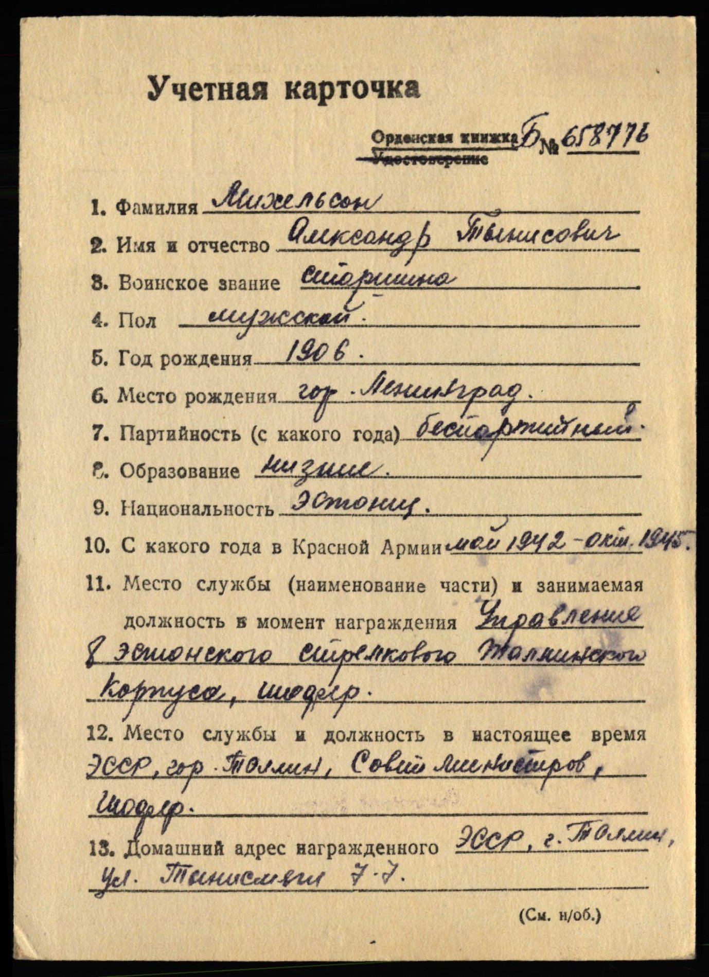 tossom kirjutas: N Mär 25, 2021 11:09 am Ka Punatähe orden nr. 939477 on siin teemas olnud varem, kuid nüüd on autasustatu teada. Selleks on vanemseersant Leopold Karu, 8. Eesti Laskurkorpuse poliitosakonna autojuht.