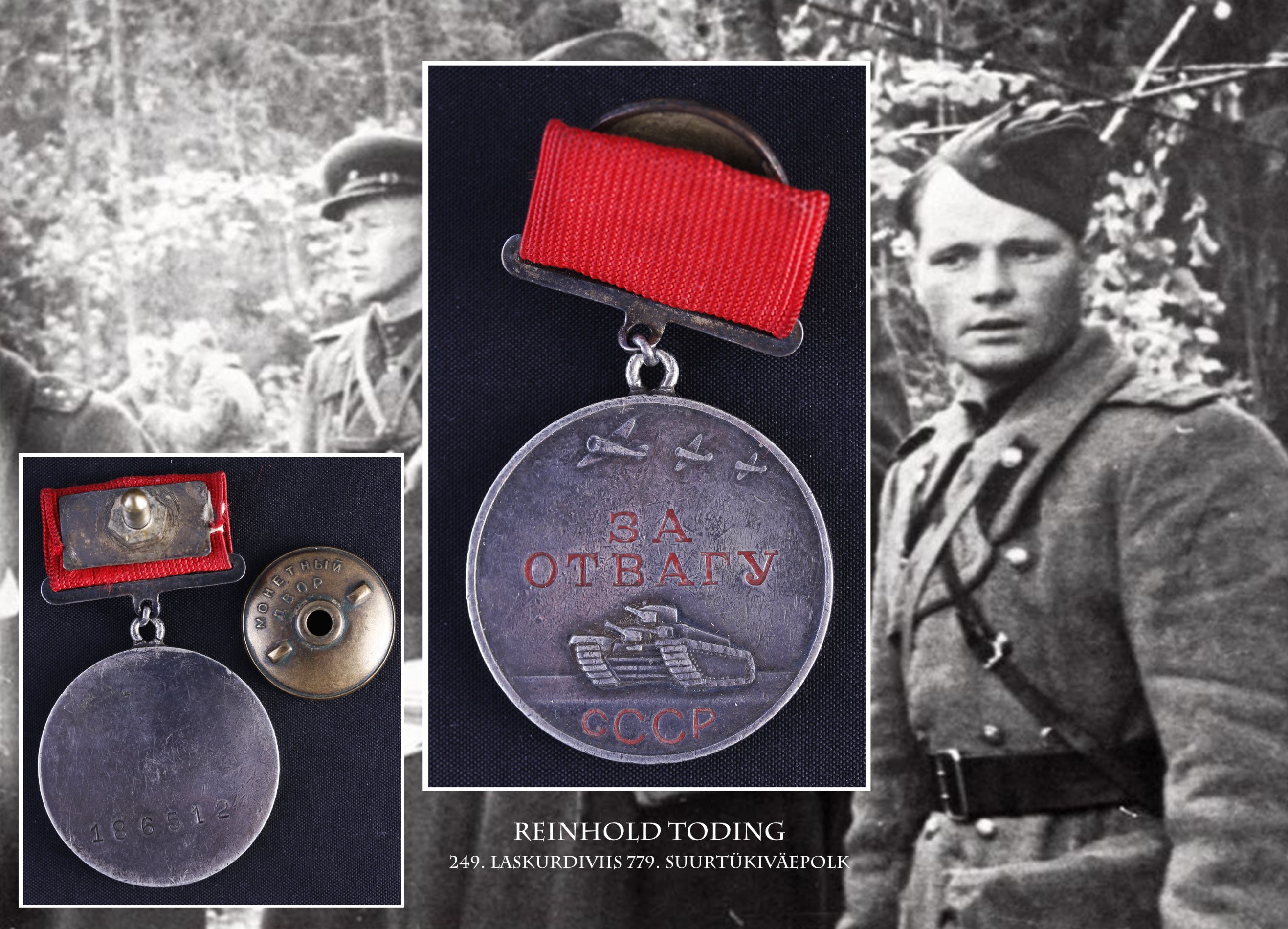 Seda Vapruse medalit (186512) olen siin aastaid tagasi varem näidanud aga nüüd on ka omanik teada. Autasu annetati Velikije Luki lahingute eest 1943. aasta 19. jaanuaril 8. ELK'i 249. laskurdiviisi 779. suurtükiväepolgu seersandile Reinhold Toding'ile. Mäletan, et kui medali kunagi sain siis oli see ilma lindita ja kolodka leidsin hiljem kusagilt juurde. Peale Vapruse medali sai ta ka Isamaasõja ordeni 2. järgu (124656) ja medali "Moskva kaitsmise eest". Märgi taustaks olev Rahvusarhiivist pärit foto on tehtud 1945. aastal ja mees foto paremas servas on Reinhold Toding. Lisan ka ChatGPT tehtud tõlke autasulehelt, mingil põhjusel on ta seal dokumendis märgitud venelaseks aga teistes sõjaaegsetes dokumentides on ta ikka rahvuselt eestlasena kirja läinud.