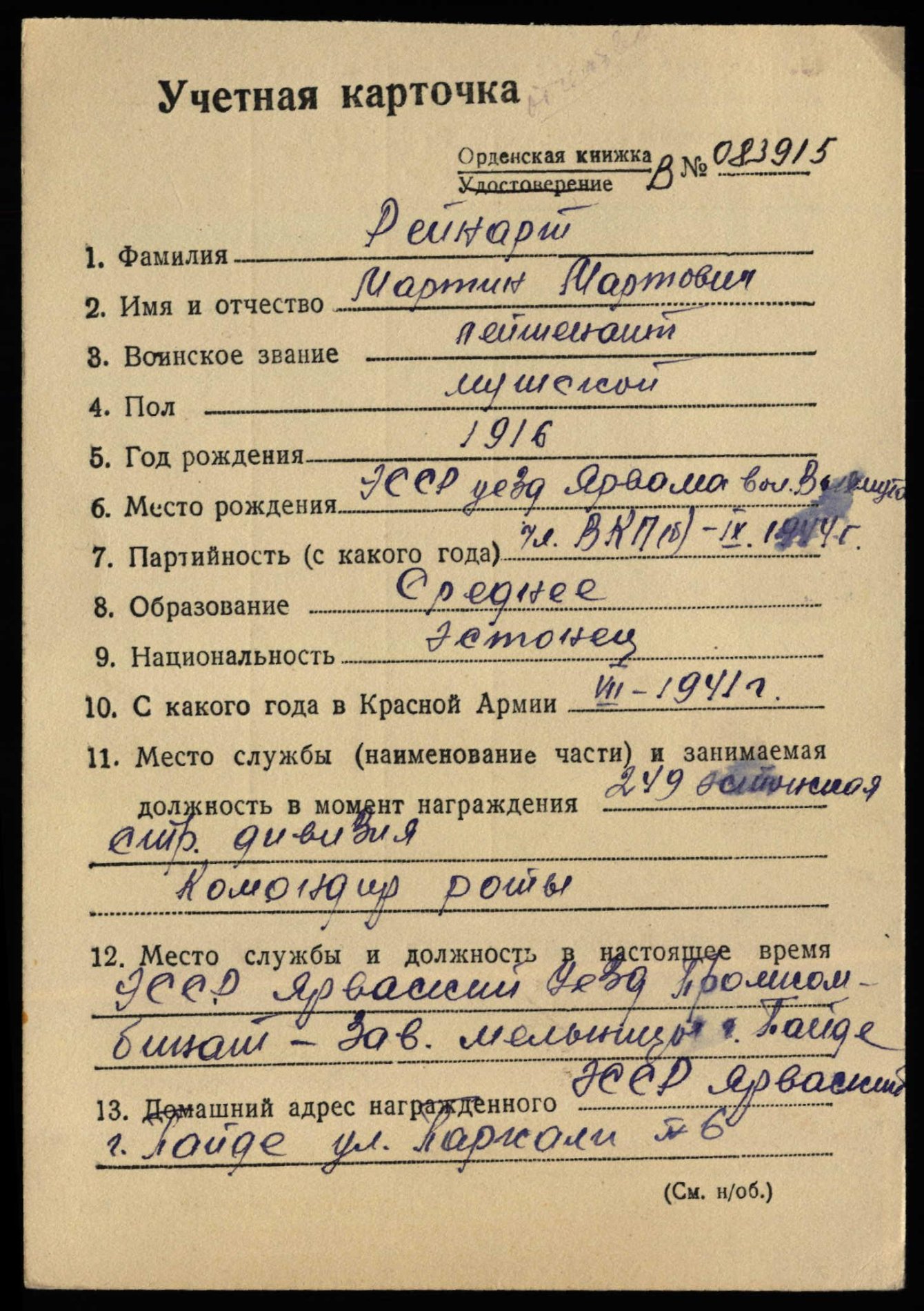 See orden on siin juba varasemalt olemas, aga nüüd on ka tausta kohta midagi teada. Niisiis- vanemleitnant Martin Reinart, autasustamise hetkel 249. Laskurdiviisi 917. laskurpolgu pataljonikomandöri abi, Isamaasõja ordeni II klassi ordeni nr. 450523 kavaler. Reinart on 1944.a saanud ka Punatähe ordeni, selle numbriks on 516437 ja antud Velikije Luki lahingutes osalemise ja haavatasaamise eest.