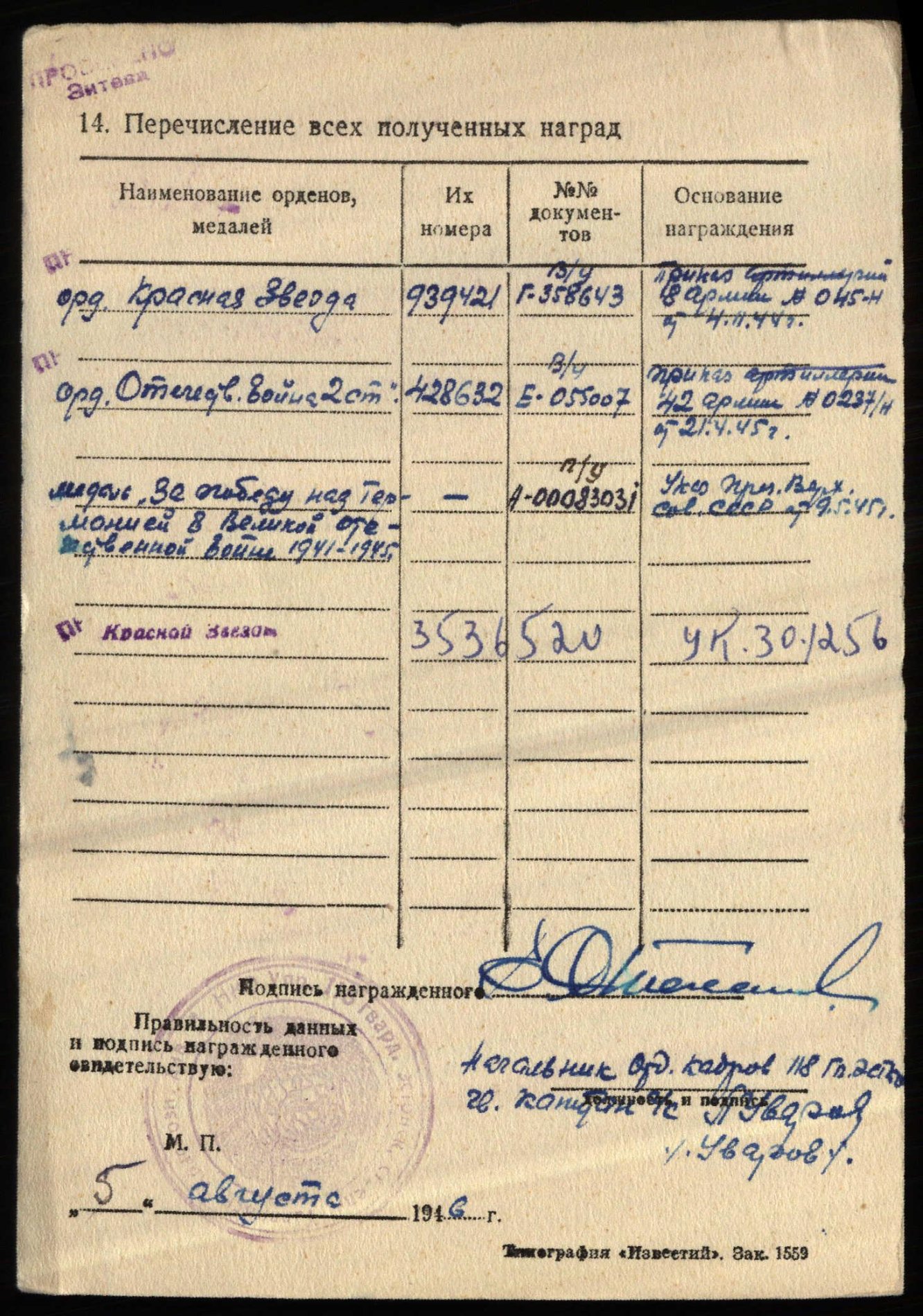 Major Mihail Zmur, 249. Eesti Laskurdiviisi 925. laskurpolgu komandöri abi varustusalal. Punatähe ordeni 1309156 kavaler. See orden (nagu ka autasulehel näha olevad Punalipu orden nr. 310781 ja Lenini orden nr. 203742) on antud talle Punaarmees väljateenitud aastate eest. Zmur on ka Isamaasõja II klassi ordeni nr. 427270 kavaler ja selle sai ta 1945. a märtsis Kuramaal, kus organiseeris väga rasketes tingimustes polgule materiaal- tehnilist tuge ning osaliselt ka lahingute eest mis toimusid varasemalt Eestimaa pinnal.